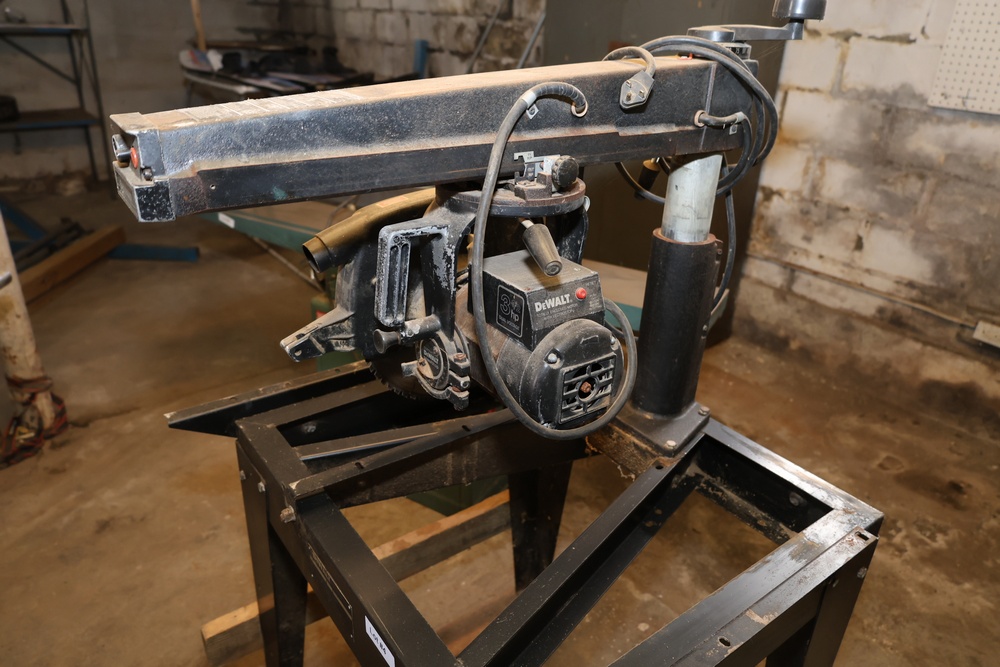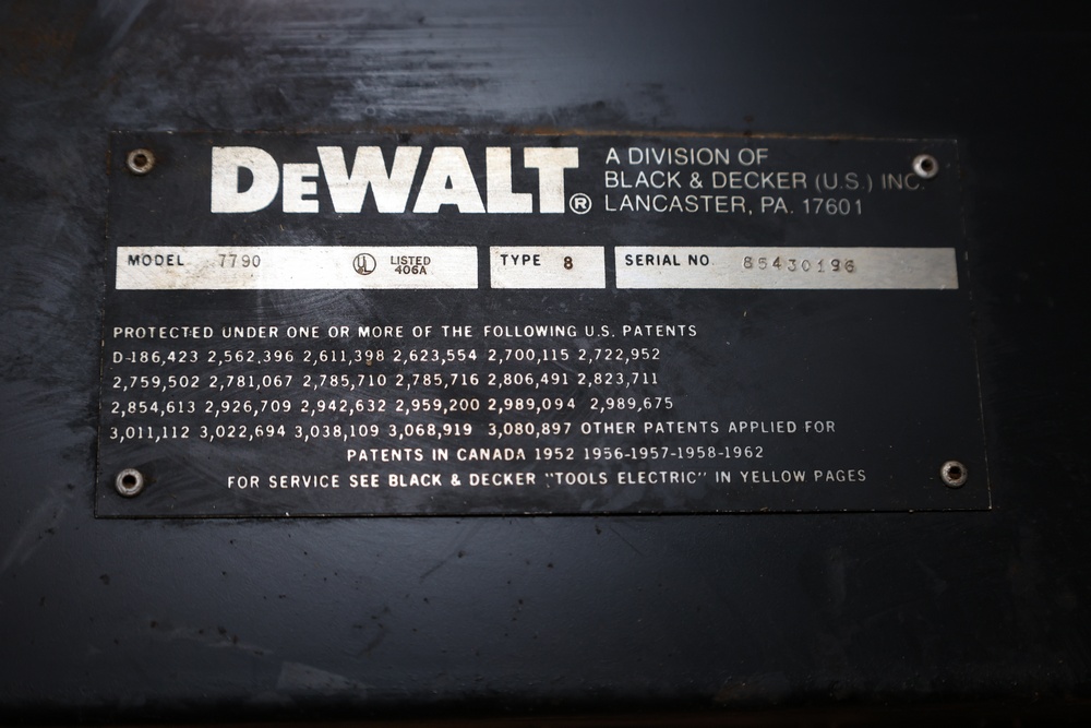 DeWalt model 7790 12" radial arm saw, 3½ HP dual-voltage motor with automatic brake, mounted on a heavy-duty steel stand. Features adjustable arm with bevel and miter capability, 12" (300mm) blade capacity, and cutting depth up to approximately 4" (102mm). Equipped with Contractor’s PowerShop controls, angle gauge, and integrated handle adjustments for precision crosscuts, bevels, and compound miters. Designed for woodworking, framing, and general shop applications.