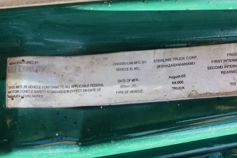 2004 Sterling LT9511. Engine: 6 Cyl diesel C-12 MBL. Transmission: Eaton Fuller RTOF16908LL. Truck comes with a sander and front plow also a 13’ steel dump body. Tires: Front 315/80R22.5 Rear 11R24.5, Truck GVWR 64,000lbs. 136,540 Miles, Truck Starts and moves, has rust issue. VIN: 2FZHAZASX4AM64981. Asset Tag 15516