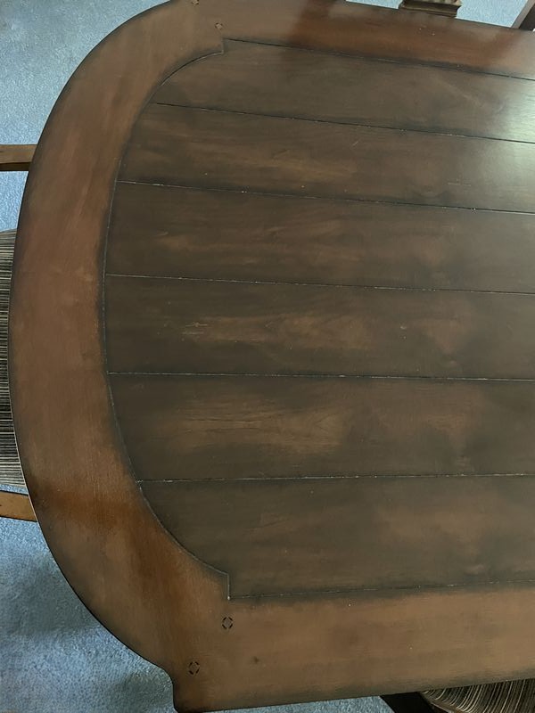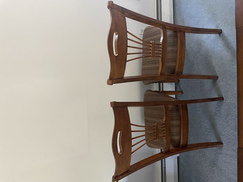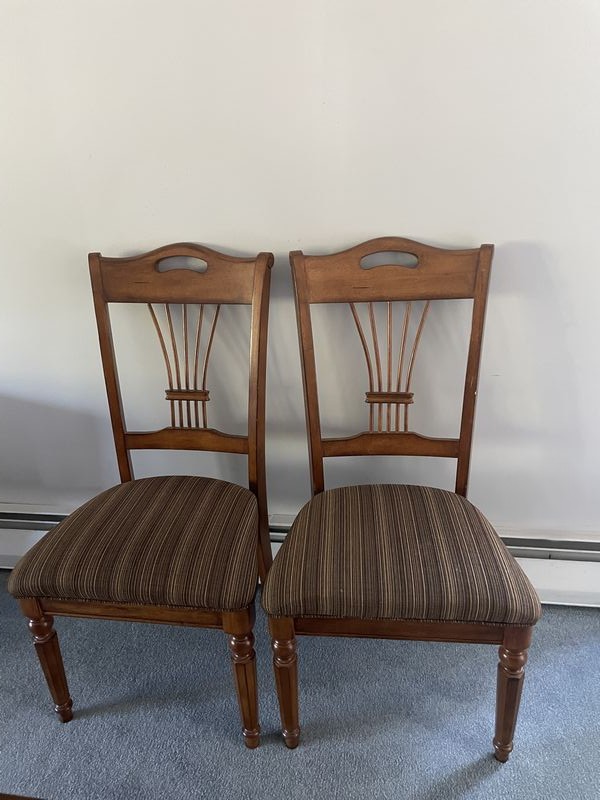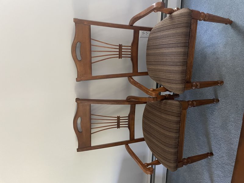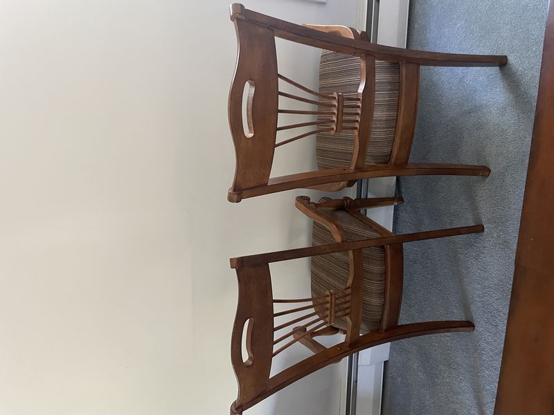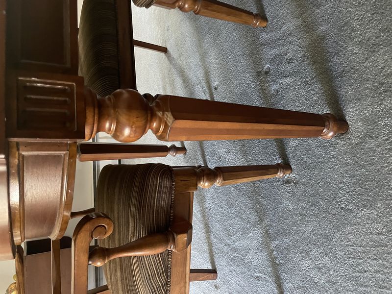 Formal Dining Set. Beveled oblong dining table with panel inlay & carved legs (poss cherry finish), approx. 86"Lx40"Wx29.5, one table insert, 18"W; set/6 matching spindle back chairs with upholstered striped seats (two arm, four side, ea. approx. 22.5"Wx18"Dx42"H. See photo for details. Loc up one flight in raised ranch.