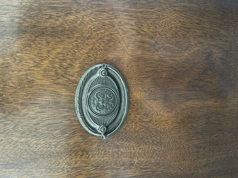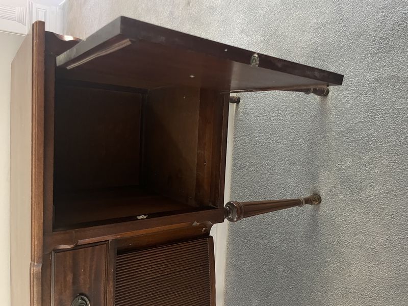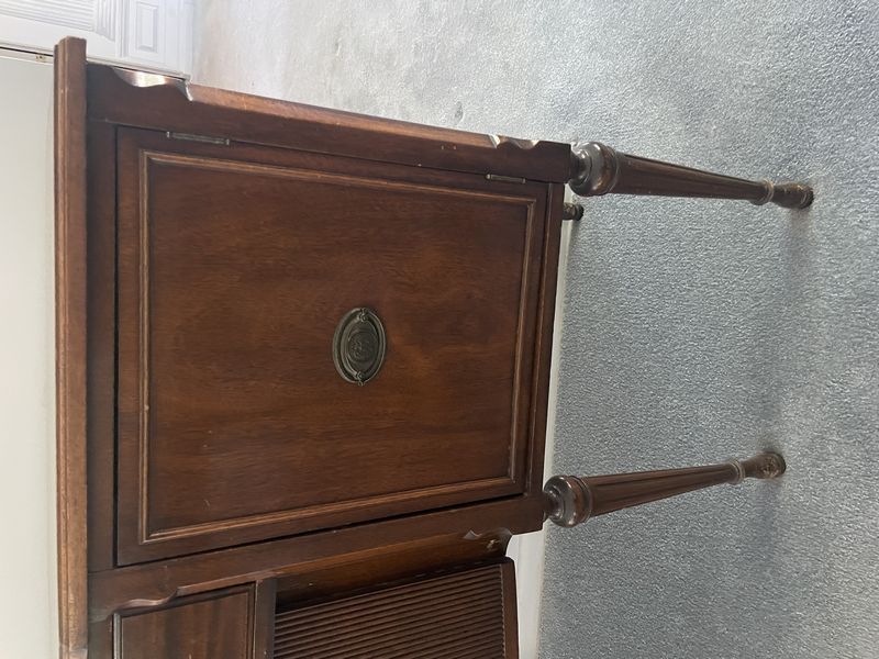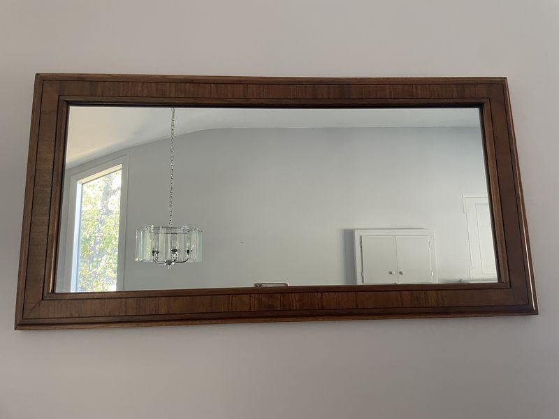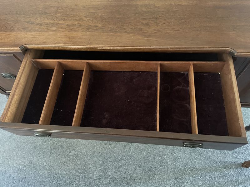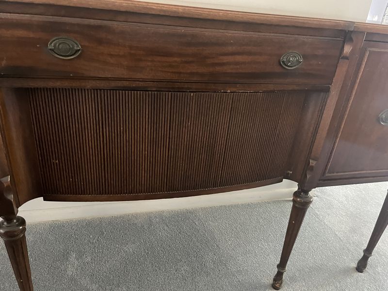 Sideboard Buffet, Wall Mirror. Hardwood buffet with single dovetailed drawer, felt lined with wood dividers & two cabinet doors (brass HW), 65.5"Wx21"Dx37"H; coordinating wood framed wall mirror. Matches hutch in Lot #4. Loc up one flight in raised ranch.