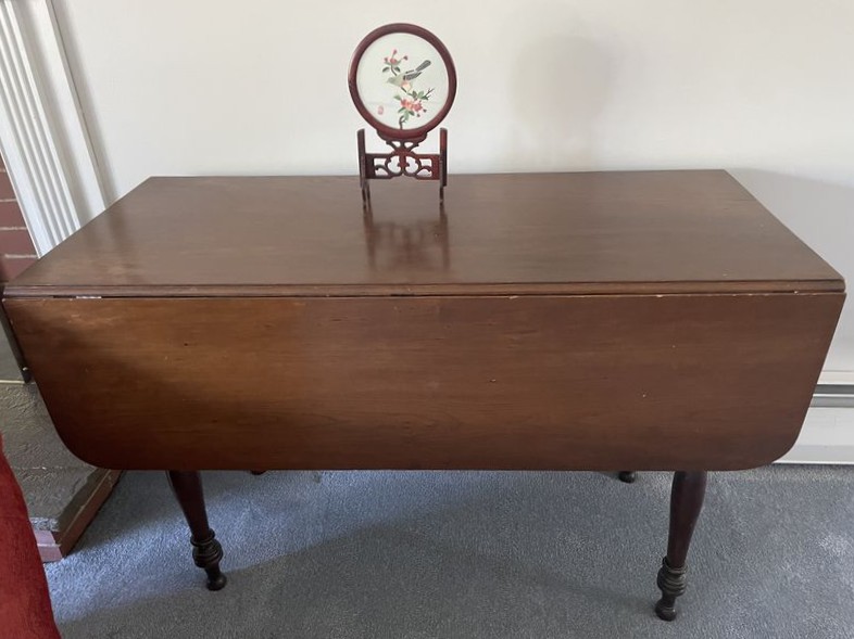 Swivel Chair, Drop Leaf Table. Jessica Charles fully upholstered vintage swivel barrel chair, 31"Wx21"Dx30"H; hardwood drop leaf table, opens to 44"Wx45"Dx29"H. Loc up one flight in raised ranch.