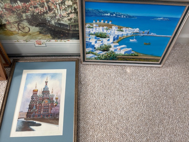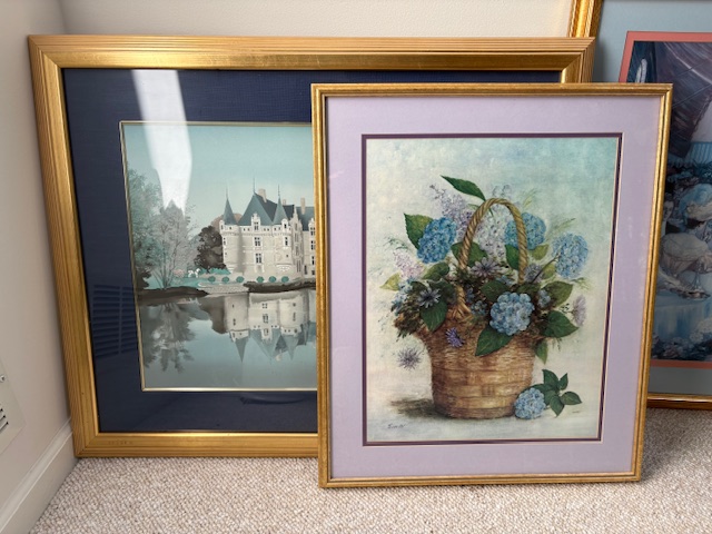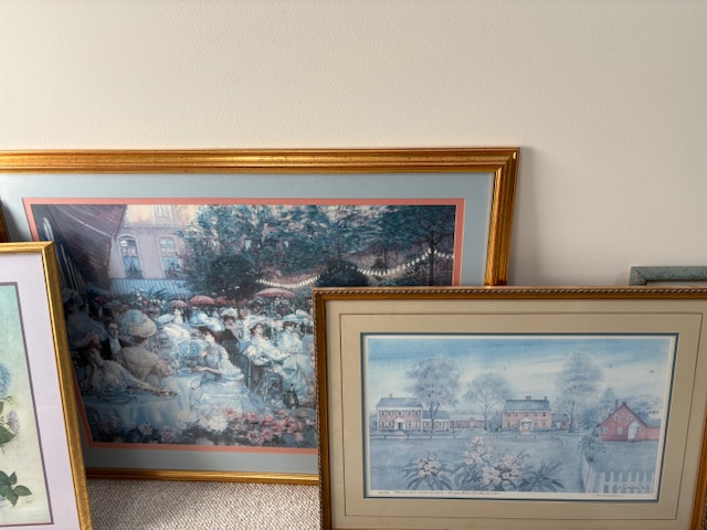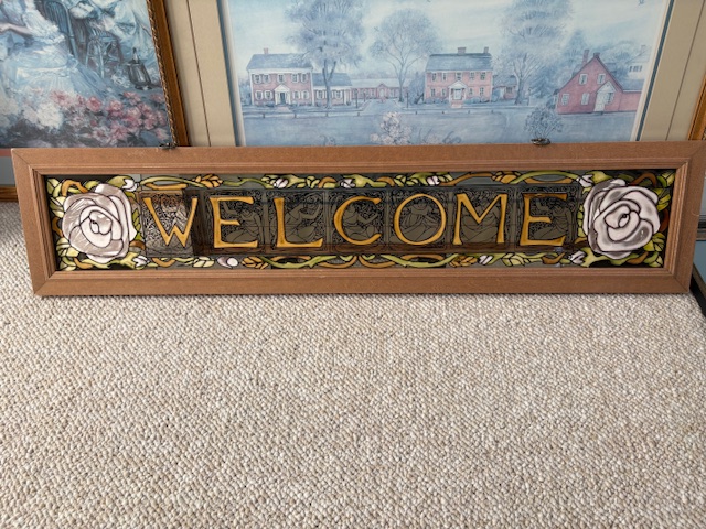 Wall Art. Seven pieces plus stained glass Welcome sign: all framed, most matted & behind glass (some signed), largest wall art, 29.5"Wx38"H; wood framed, stained glass welcome sign, 38.5"Wx6"H. See photos for details.