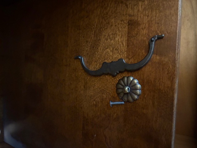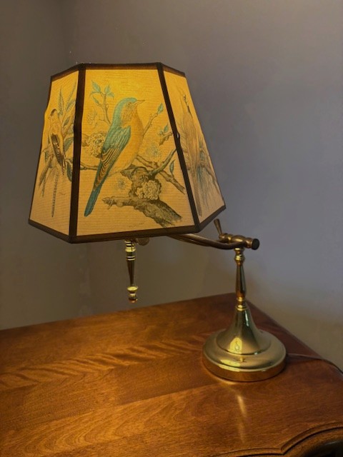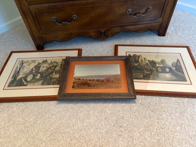 Ethan Allen Armoire Cabinet, Décor. Clothing armoire, 41"Wx19.5"Dx57.5"H with dovetailed drawer (one handle detached, included); brass adjustable arm table lamp; wood box with brass HW (Asian influence); three prints (largest 17"Wx21.5"H). See photos for more details.
