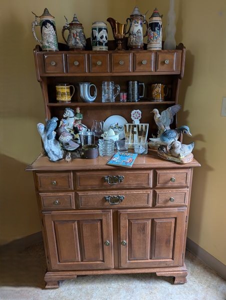Temple Stuart Hutch, Barware. Temple Stuart colonial maple hutch with dovetailed drawers & original HW, 38"Wx19"Dx6'H; decor items, ent, authentic steins; liquor decanters (emptied). Several German steins (see photos maker's mark); medieval pewter Duratale horn stein by Leonard; vintage etched and cut glass stemware; cordials; beverage glasses; other related items as seen in photos.