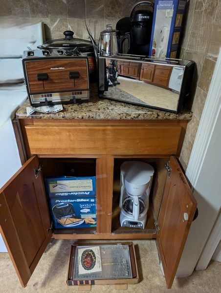 Vintage and Modern Countertop Appliances. Hamilton Beach slow cooker; Keurig coffee maker; Swift hand blender; SS electric coffee pot; Mr. Coffee coffee maker; two four-slice toasters; Proctor-Silex sandwich toaster; electric hot plate.
