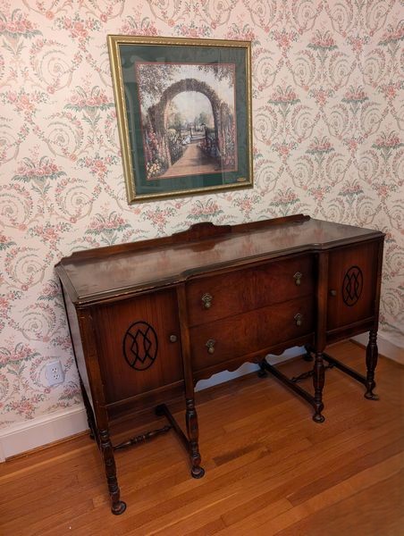Vintage Sideboard Buffet, Wall Art. Brickweed Brothers Better Built Furniture sideboard buffet with two large dovetailed drawers, cabinet storage & high legs, 58"Wx22"Dx37"H with sliding flatware tray; Glynda Turley framed & double matted limited edition wall art #2389/2500.