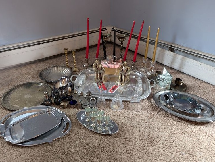 Metal Entertaining, featuring Sterling Pieces. Vintage metal entertanining pieces including silver, silver plate, brass. Candlestick holders (tallest 1'H); platters (largest 26"Lx18"W); salt & pepper; cordials; condiment; baby set; collector's spoons; bookends; more! See photos.