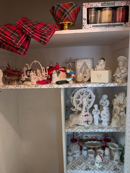 Christmas Décor, featuring Lenox. Porcelain musical Christmas Ferris wheel, 1'H marked KS; Lenox 1999 porcelain snowman in sleigh (with box); Mikasa angel bell; cardinal bell; Nantucket painted bowl; Christmas dish set (see makers); Fifth Avenue crystal boat dish (with box); stemware; figurines; Yankee Candle boxed gift set; linens; more! See photos.