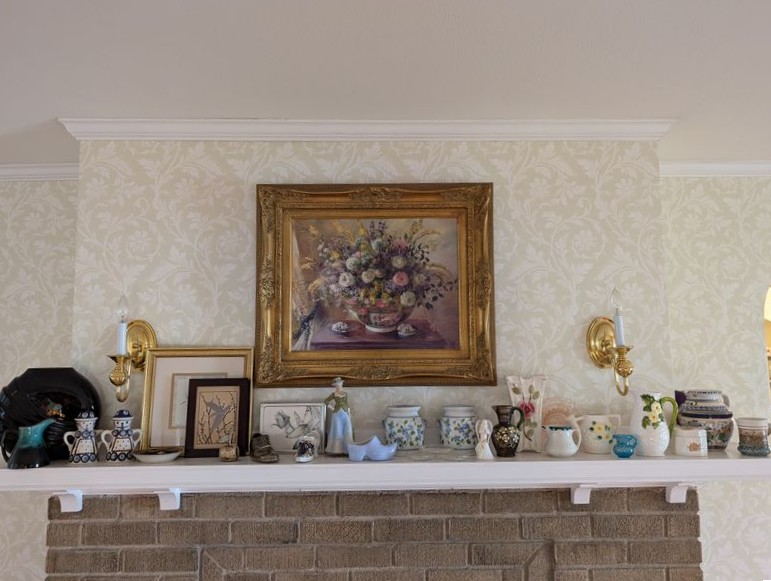 Mantle Décor, featuring Polish Pottery. Signed floral print in 3.5"W gilt frame, 23"Wx26"H; Polish Pottery "person" shakers; handled pottery pitcher (repaired); three porcelain shoes (see maker's); musical hand-painted figurine; pr hand-painted porcelain candle tart vessels; assorted vases and pitchers (US and Polish); set of three tall candle holders (with box). See photos for quantity & more details.