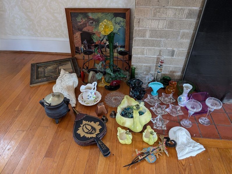 Mixed Art: Antique and Vintage Décor. Blown glass floral vase, 18"H; framed wall art (largest 19"Wx22.5"H); fireplace bellows; porcelain and glass ent pieces; three-piece glazed ceramic duck décor; antique wood "puppet" toy; antique iron and covered pot; assorted glass items, including barometer. See photos.