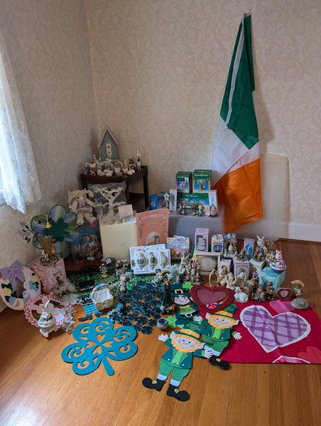 Seasonal Décor, featuring Valentine's, St. Patrick's, Easter. Lenox Luck of the Irish Tree, 1'H; set of three porcelain ornaments (boxed); figurines; books; flags; optional side table, 18"Wx20"Dx26"H.