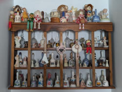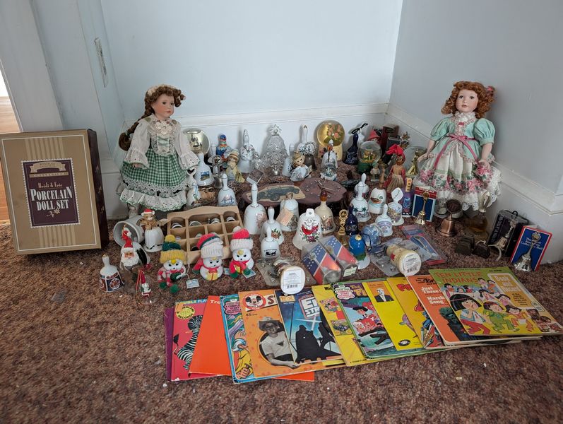 Collectibles, featuring Dolls, Books, Bells. Large bell collection (two of two); porcelain dolls, including two standing and one gift set (boxed); vintage children's books; other related items as seen in photos, handcrafted bisque porcelain Snow Bells (3) and wood clock. Loc on 2nd fl.