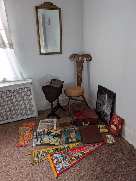 Vintage Collectibles, featuring JFK. Banjo chair, 13"daim spinning seat x40"H with stenciling; solid mahogany sewing box with contents, 1'x23"H; wall mirror, 16"Wx30.5"H; vintage Qubic 3-D tic, tac, toe boxed game; assorted pendants & magazines; two books feat JFK; vintage handled vinyl case. Loc on 2nd fl.