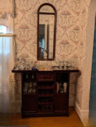 Bar Cabinet, Wall Mirror, Barware. Bar cab with sliding top (exposes cutting board), 46.5"Wx14"Dx3'H; vintage wood-framed wall mirror, 14"Wx42"H; assorted barware, including liquor decanter; bar glasses; stemware; shot glasses; drink shakers; assorted tools. See photos for more details.