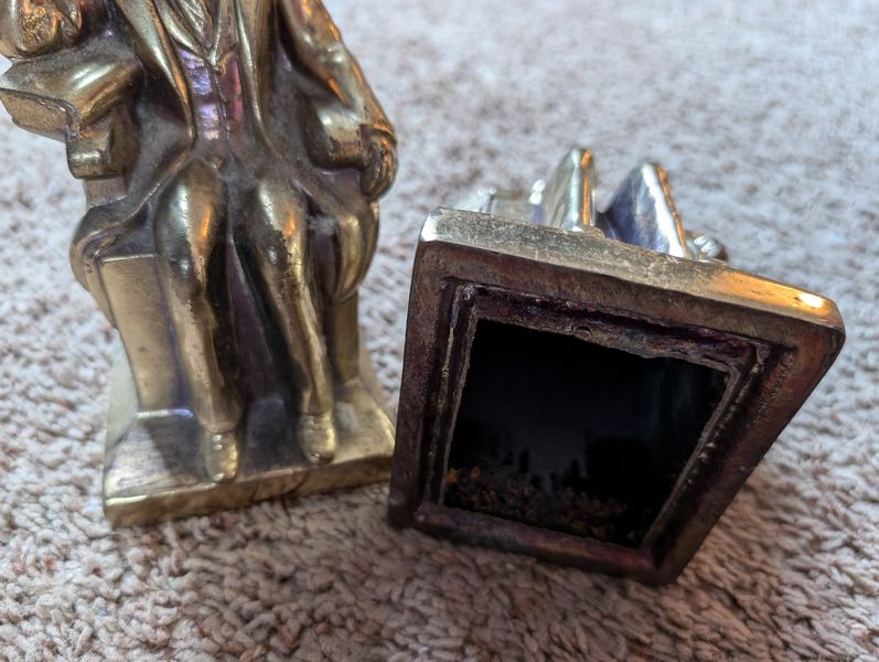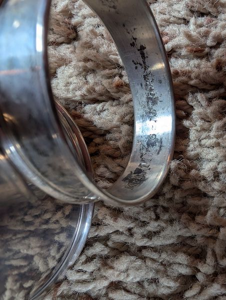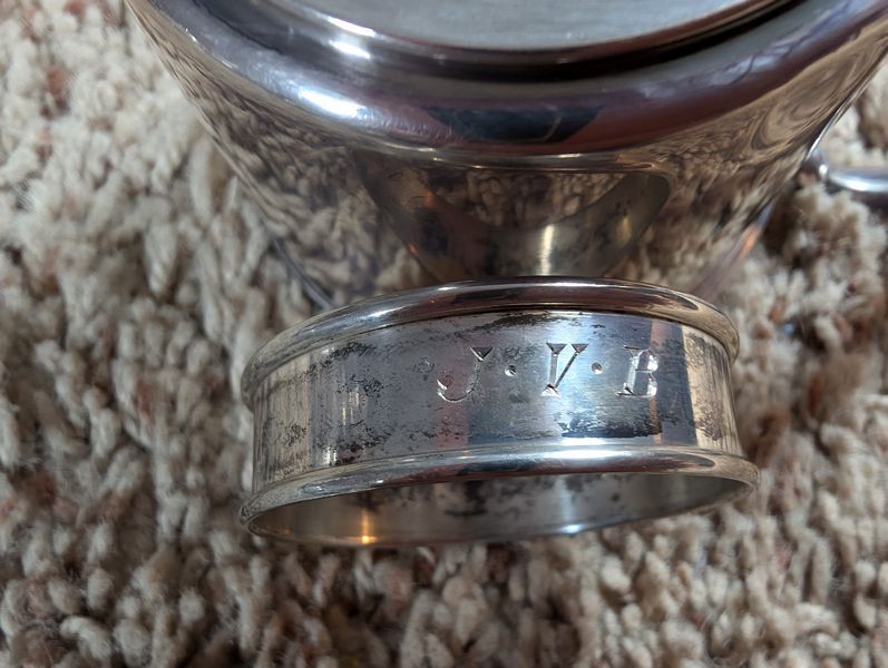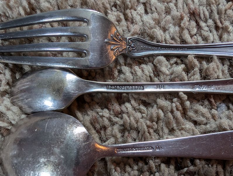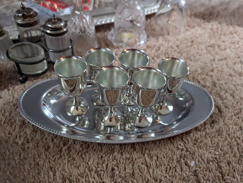 Metal Entertaining, featuring Sterling Pieces. Vintage metal entertanining pieces including silver, silver plate, brass. Candlestick holders (tallest 1'H); platters (largest 26"Lx18"W); salt & pepper; cordials; condiment; baby set; collector's spoons; bookends; more! See photos.