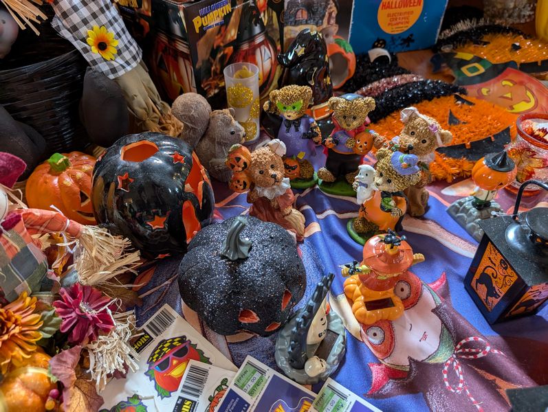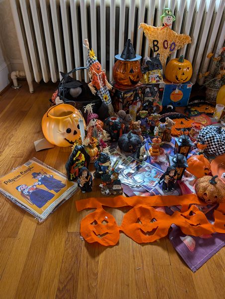 Fall Décor, featuring Halloween. Seasonal flags (one is torn); assort pumpkins (largest 24.5"H); figurines; lantern; costumes; more! See photos for quantityy & details.