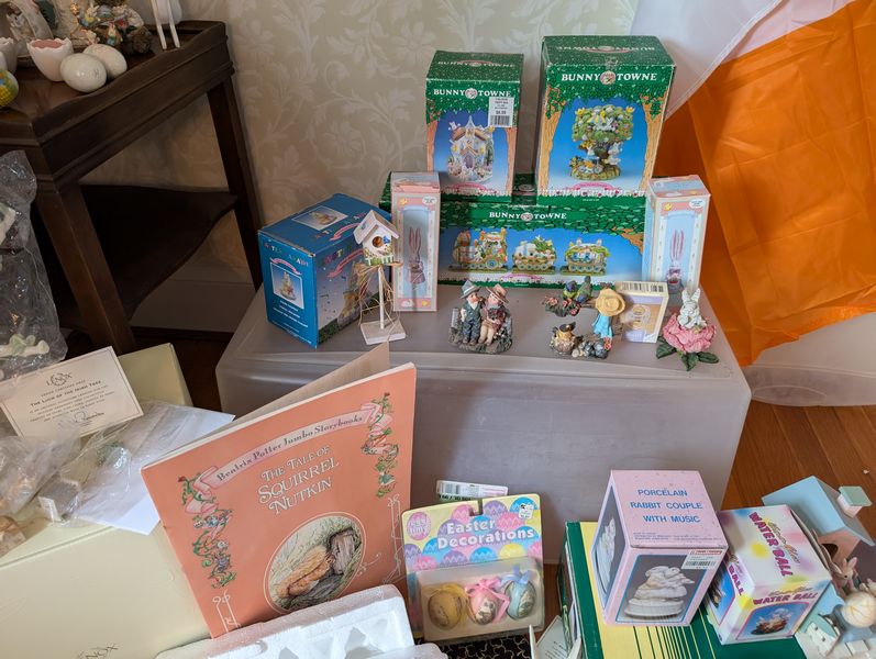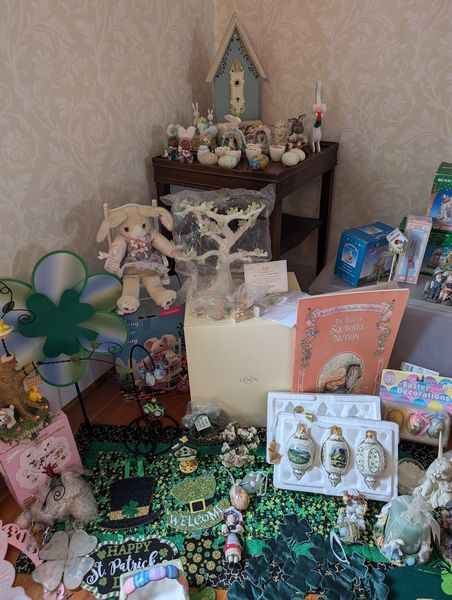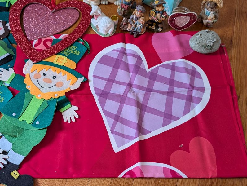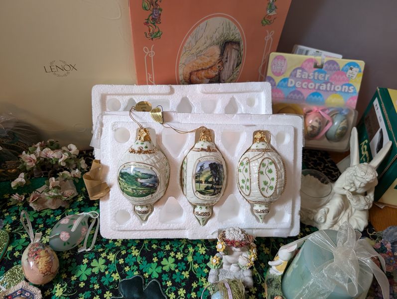 Seasonal Décor, featuring Valentine's, St. Patrick's, Easter. Lenox Luck of the Irish Tree, 1'H; set of three porcelain ornaments (boxed); figurines; books; flags; optional side table, 18"Wx20"Dx26"H.
