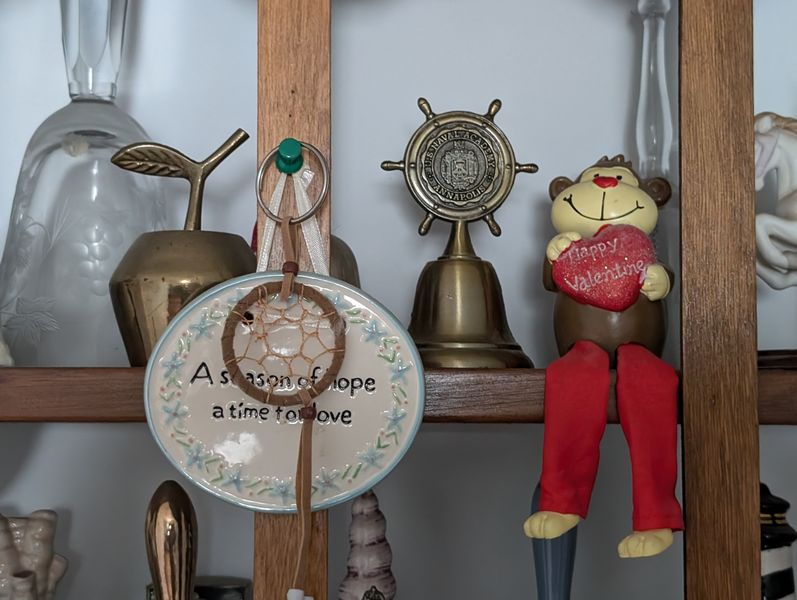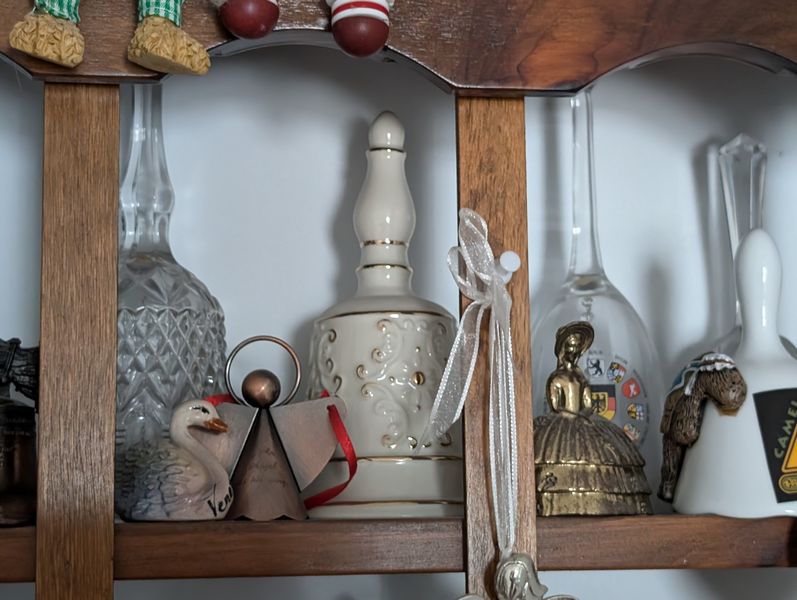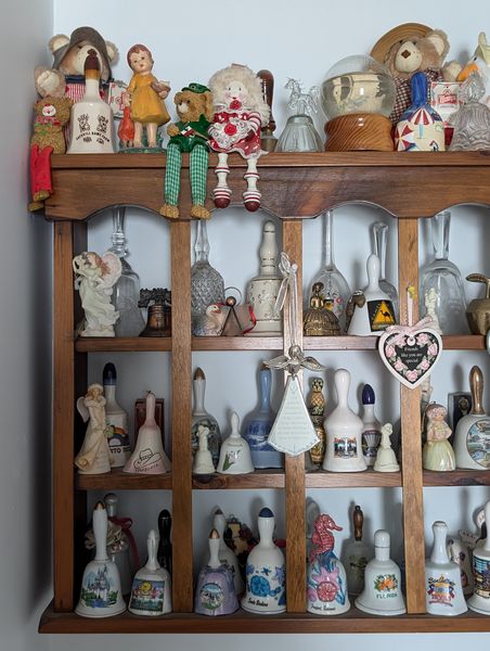 Collectibles, Wall Shelf. Very large bell collection (one of two); vintage & antique collectibles; wall display shelf, 3'Wx5.5"Dx23"H. See photos (items requires cleaning). Loc on 2nd floor,
