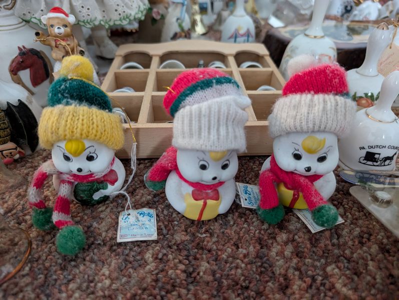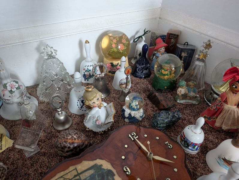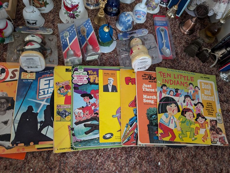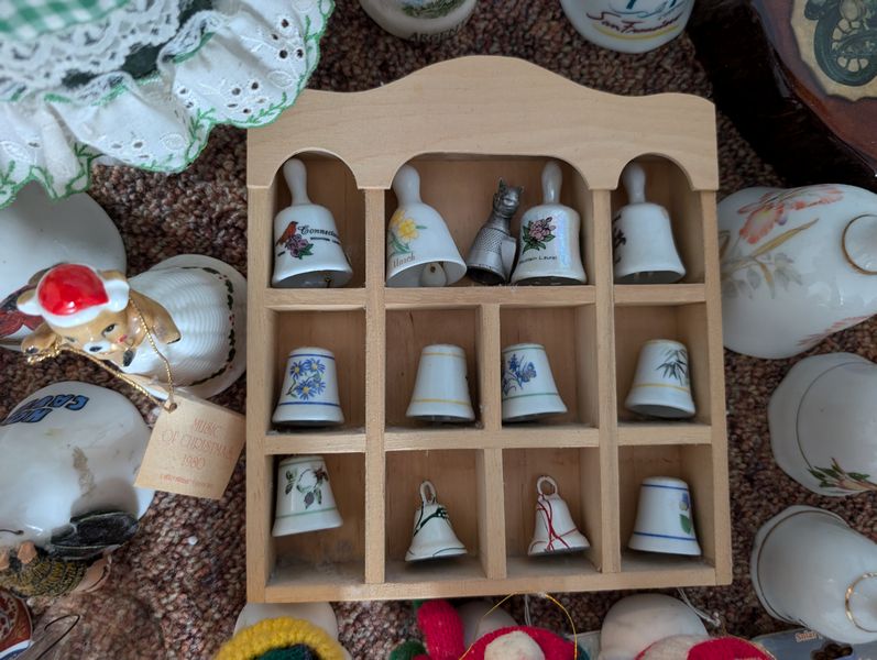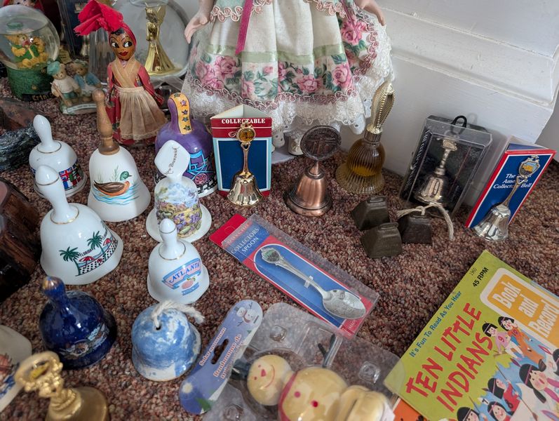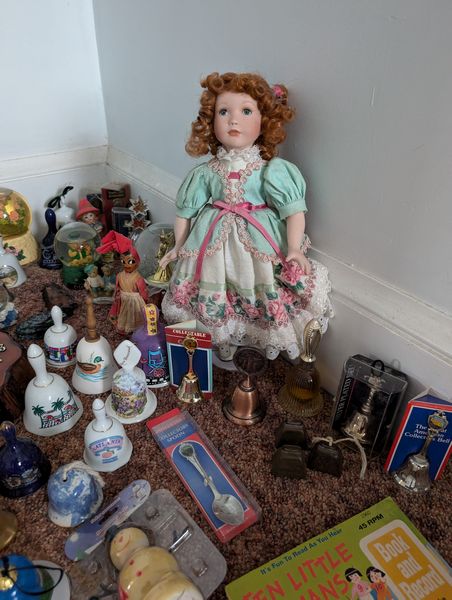 Collectibles, featuring Dolls, Books, Bells. Large bell collection (two of two); porcelain dolls, including two standing and one gift set (boxed); vintage children's books; other related items as seen in photos, handcrafted bisque porcelain Snow Bells (3) and wood clock. Loc on 2nd fl.