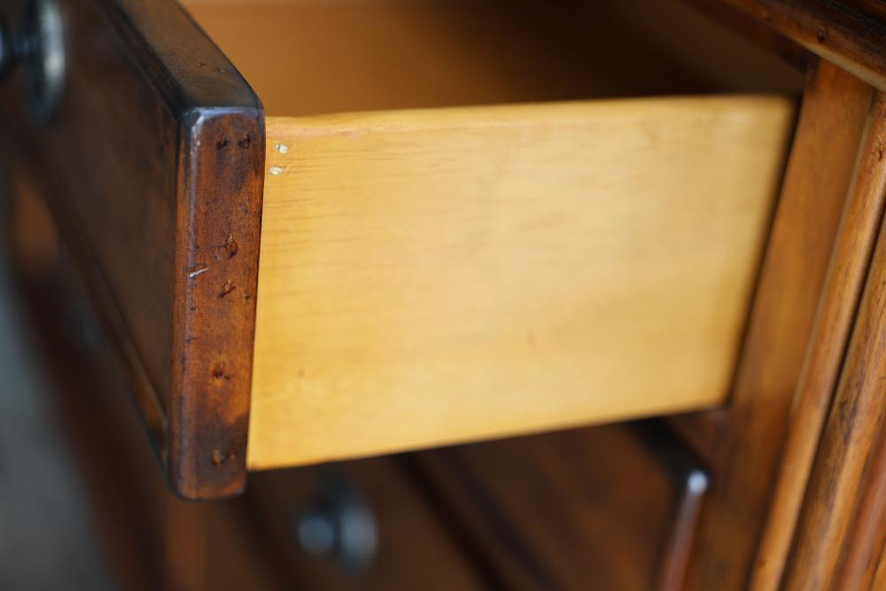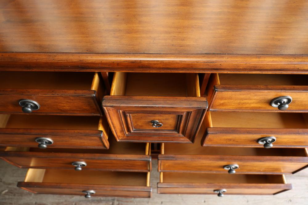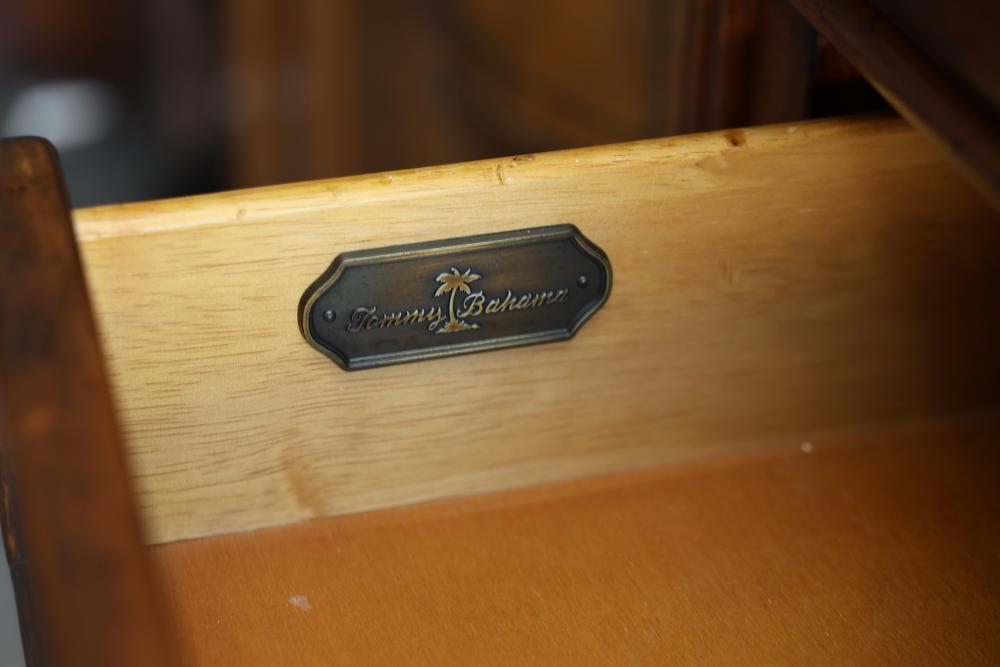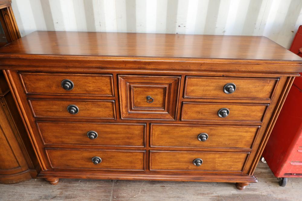Tommy Bahama Wooden Nine-Drawer Dresser. Constructed from wood with a warm finish and detailed metal hardware, it features nine drawers including a central cabinet-style drawer. Ideal for ample storage in a bedroom or other space. 64-inchx19-inchx43-inch. Pickup only.