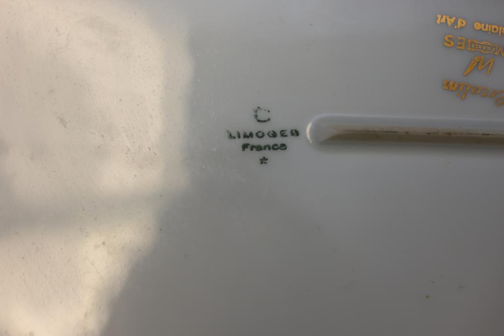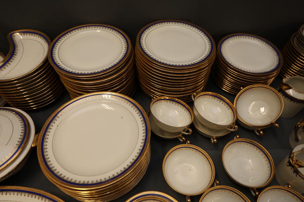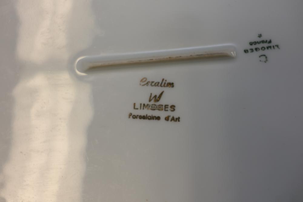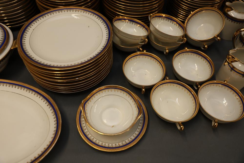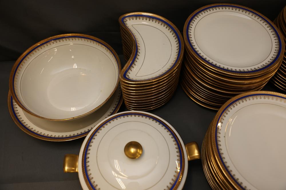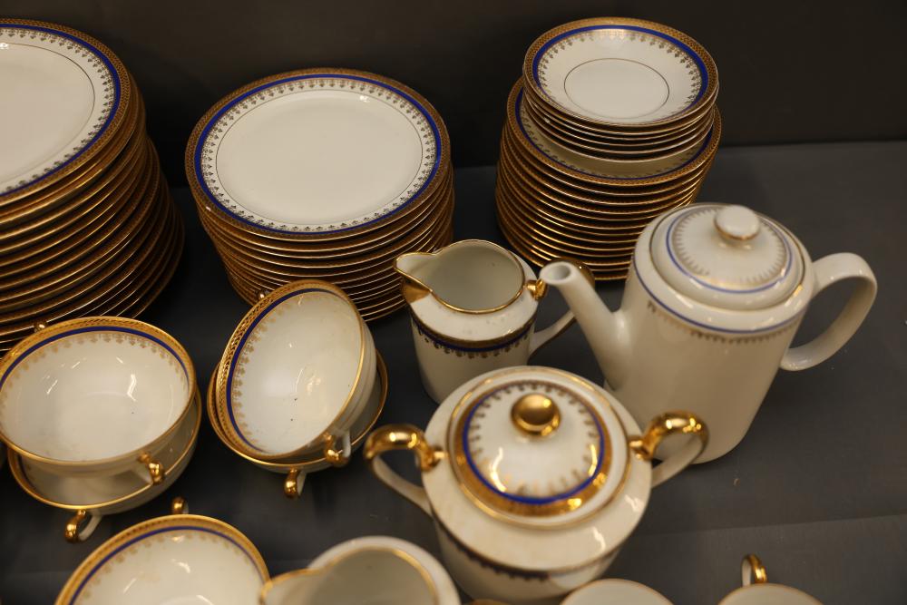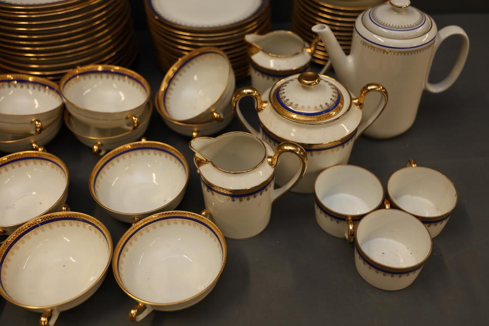 Ercalim Limoges Porcelain Dinnerware with Gilded Accents. Includes a variety of plates, cups, teapots, and serving pieces with a blue and gold trim design. All pieces exhibit a cohesive and elegant appearance, with detailed craftsmanship. Pickup only.