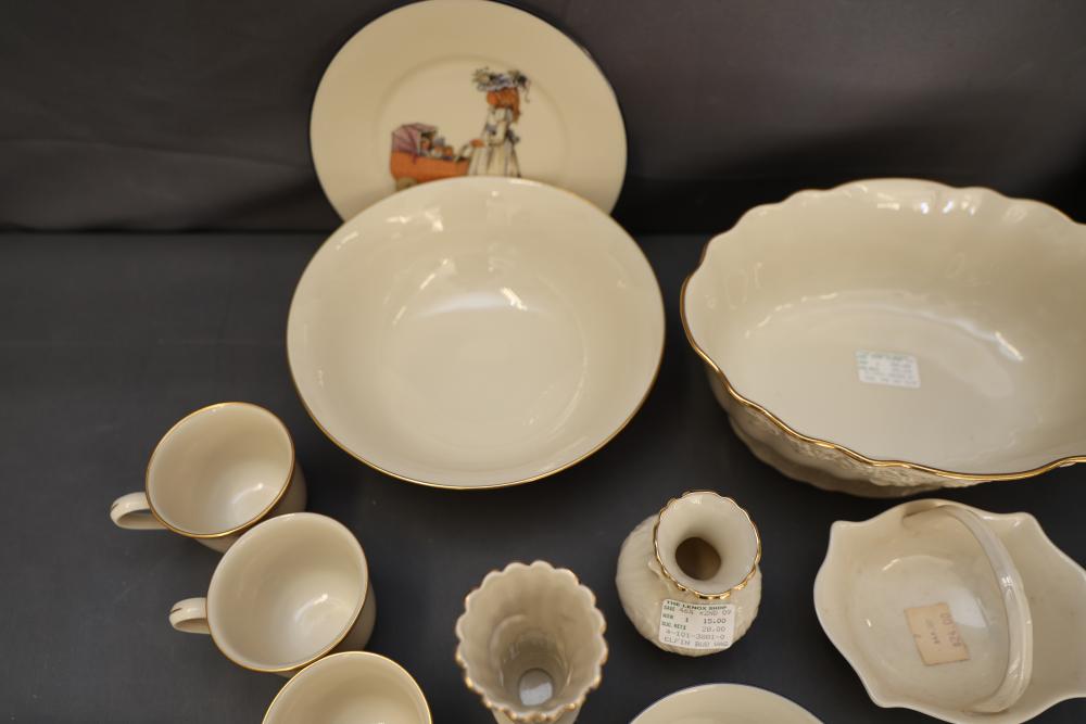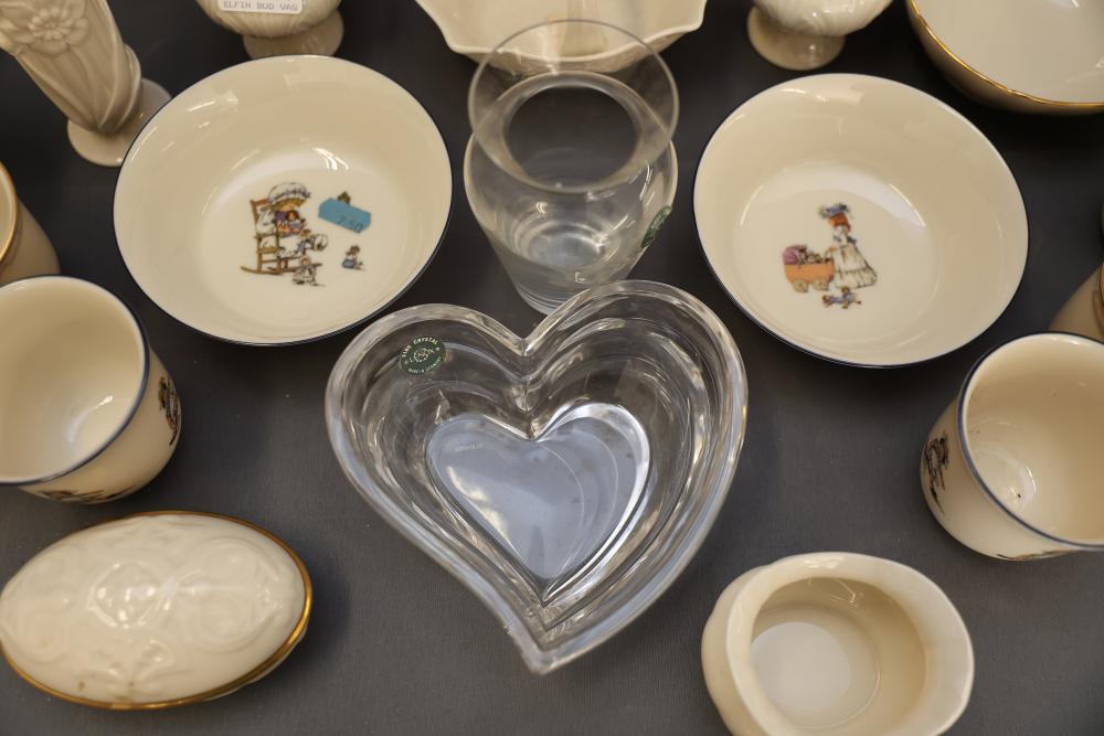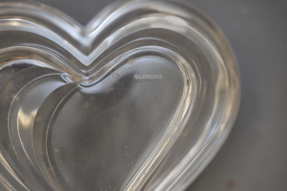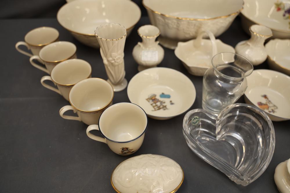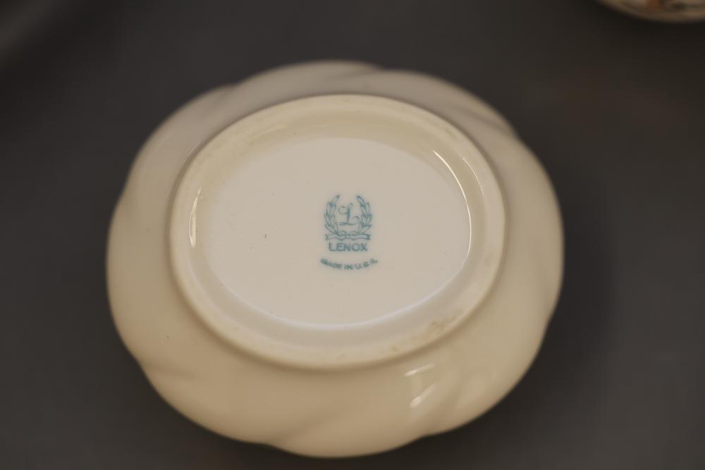 Lenox and glass tableware including plates, cups, bowls, and vases. Features hand-painted designs, gold-trimmed accents, and molded details on ceramic items. Includes glass pieces such as a heart-shaped dish and marked glassware. Pickup only.
