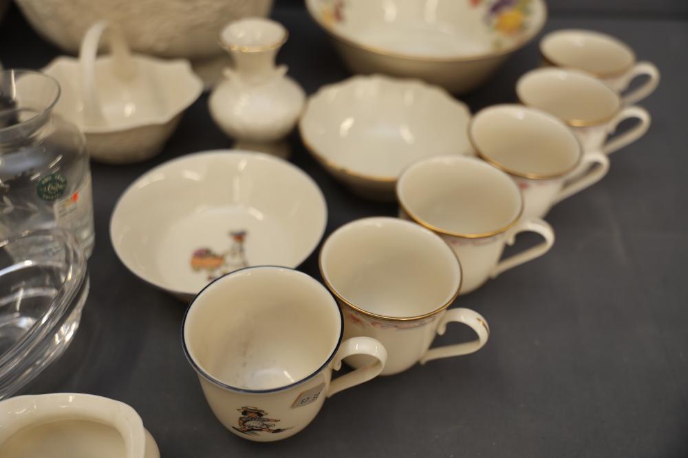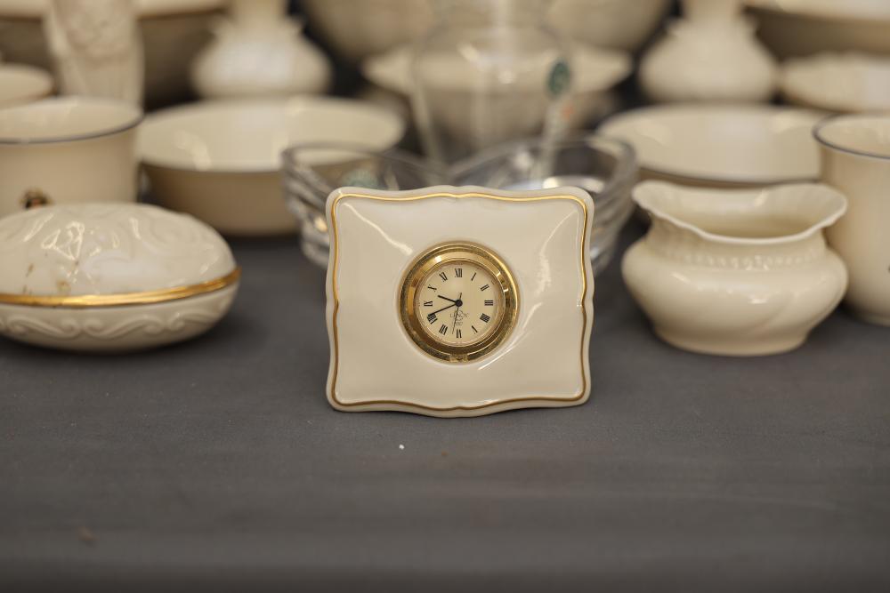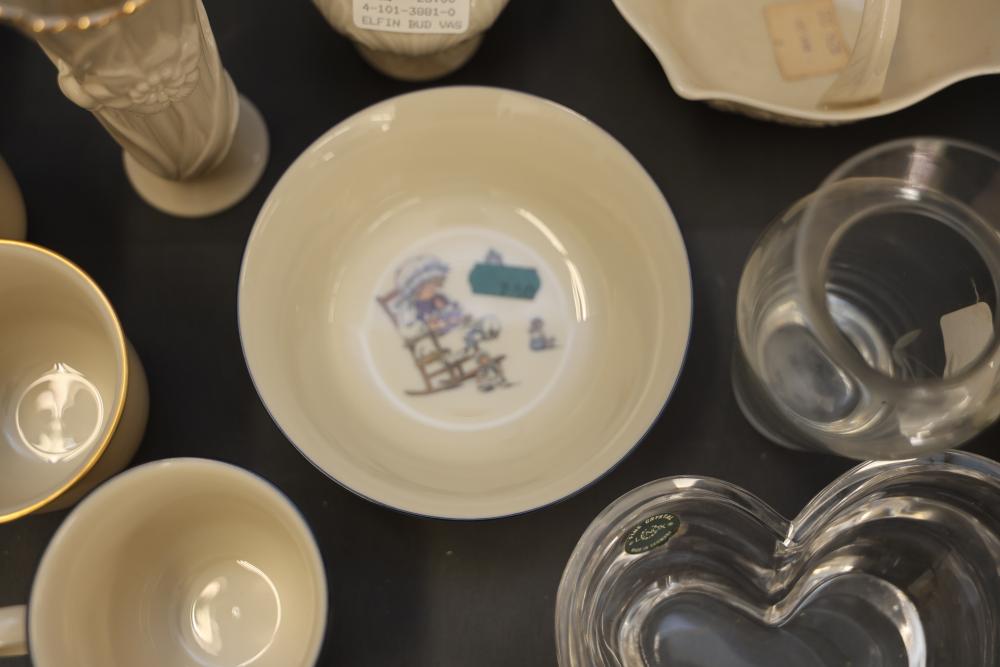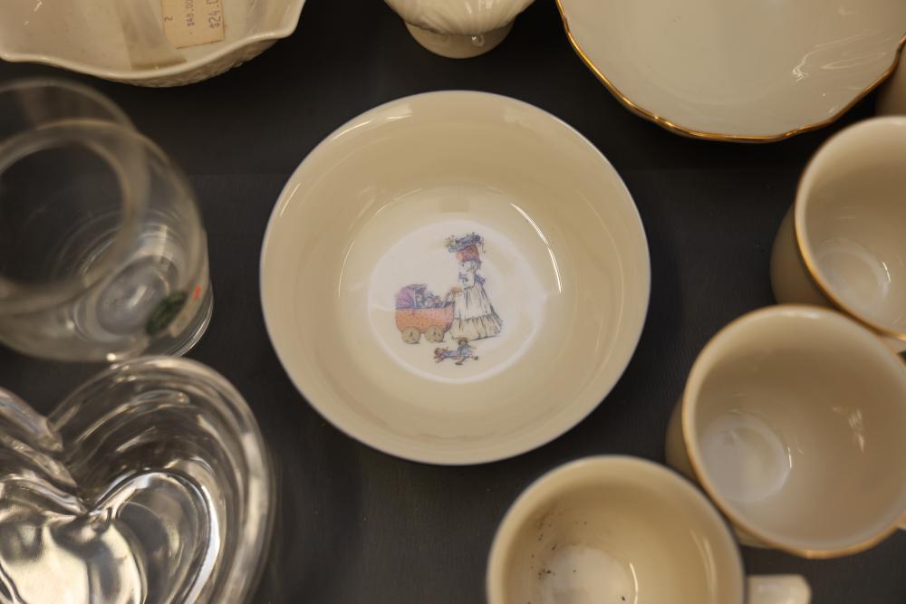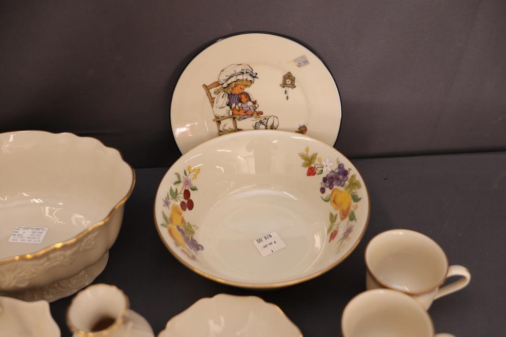 Lenox and glass tableware including plates, cups, bowls, and vases. Features hand-painted designs, gold-trimmed accents, and molded details on ceramic items. Includes glass pieces such as a heart-shaped dish and marked glassware. Pickup only.