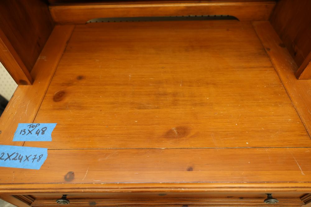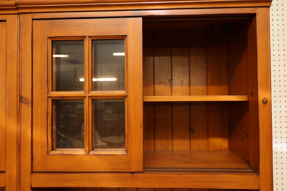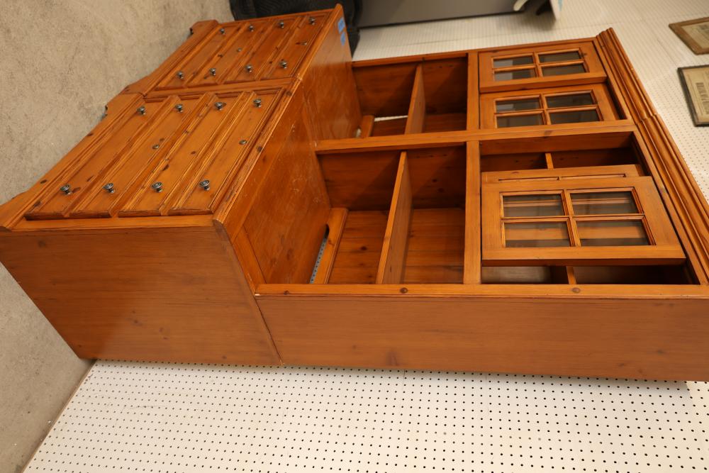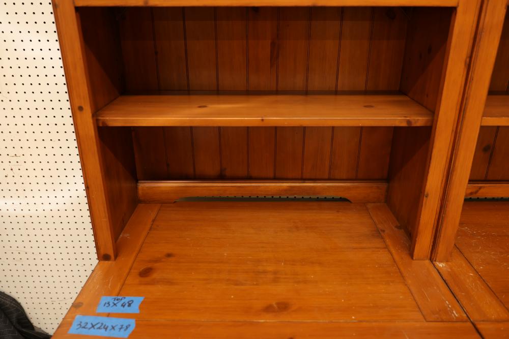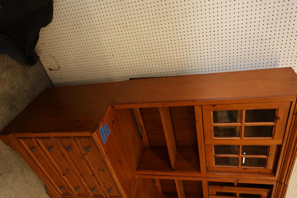 Wooden hutch featuring glass-paneled upper cabinets, two central shelves, and a lower section with multiple pull-out drawers. Dimensions are 32x24x78. Pickup only.
