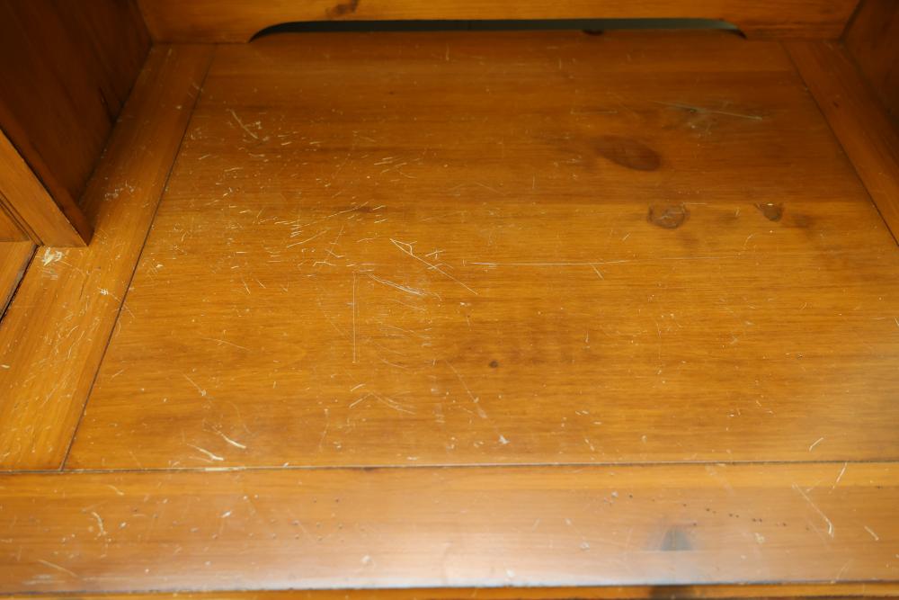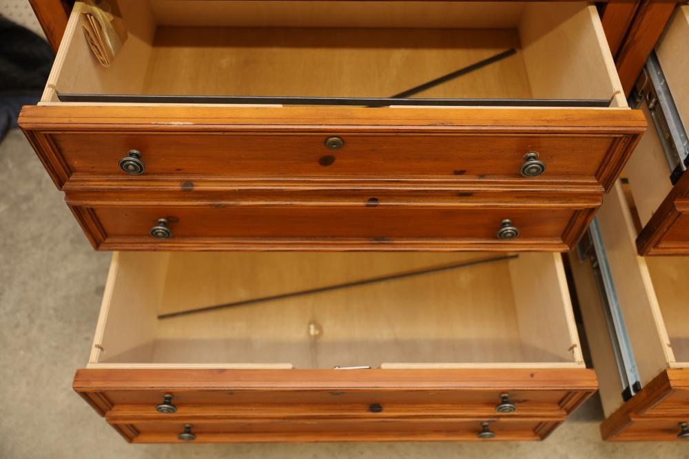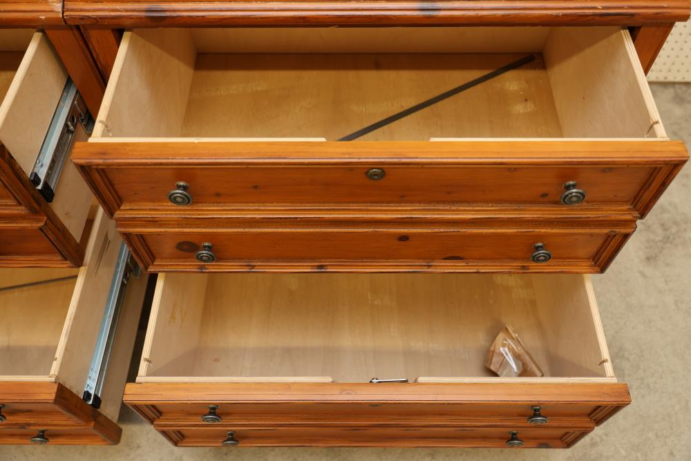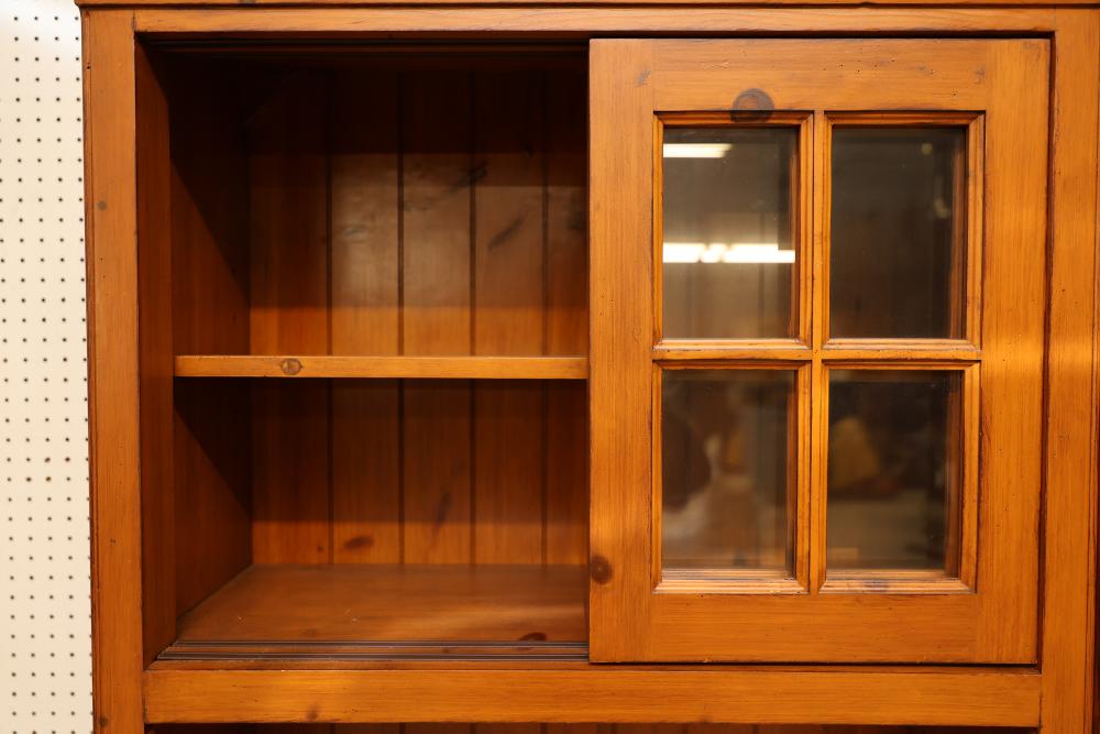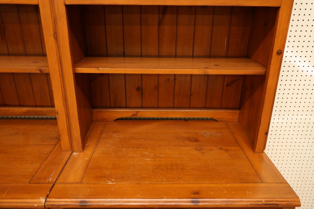 Wooden hutch featuring glass-paneled upper cabinets, two central shelves, and a lower section with multiple pull-out drawers. Dimensions are 32x24x78. Pickup only.