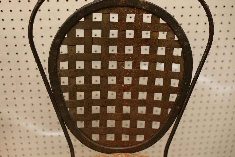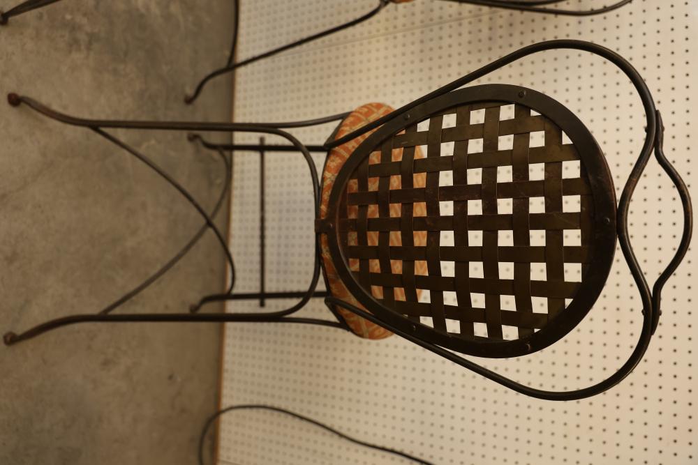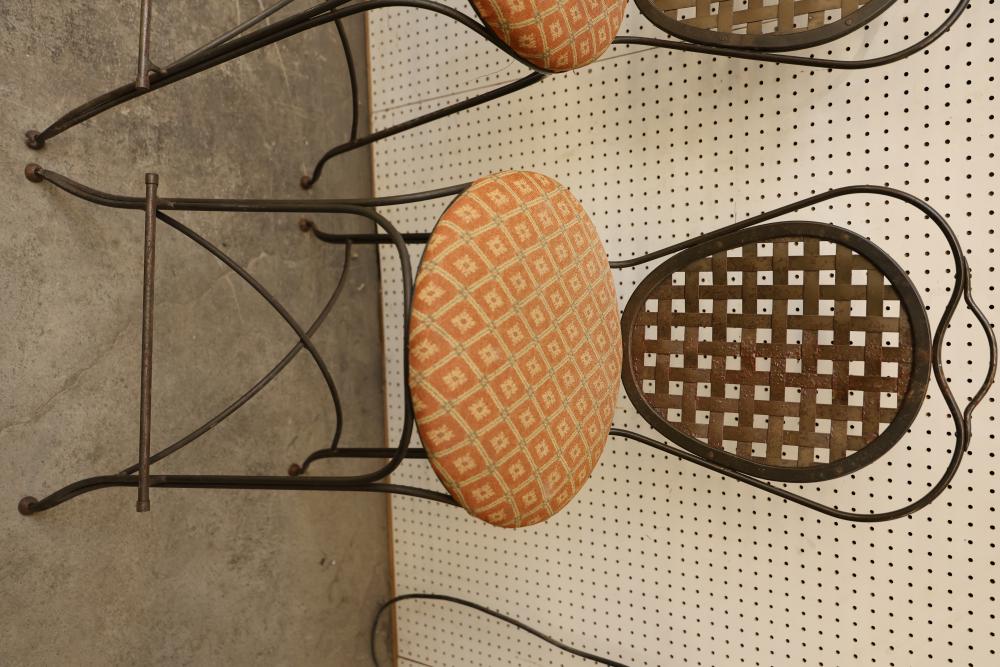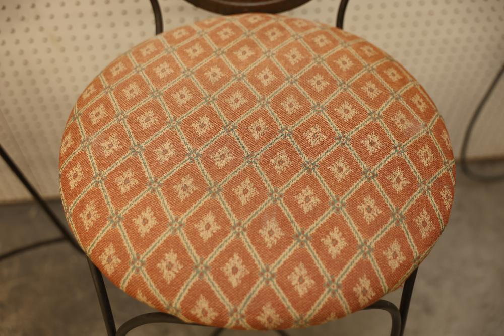 Three Metal-Frame Bar Stools with Upholstered Seats. Features metal frames with woven backrests and round cushioned seats upholstered in a patterned fabric. The stools are designed with footrests and curved detailing on the frames. Pickup only.