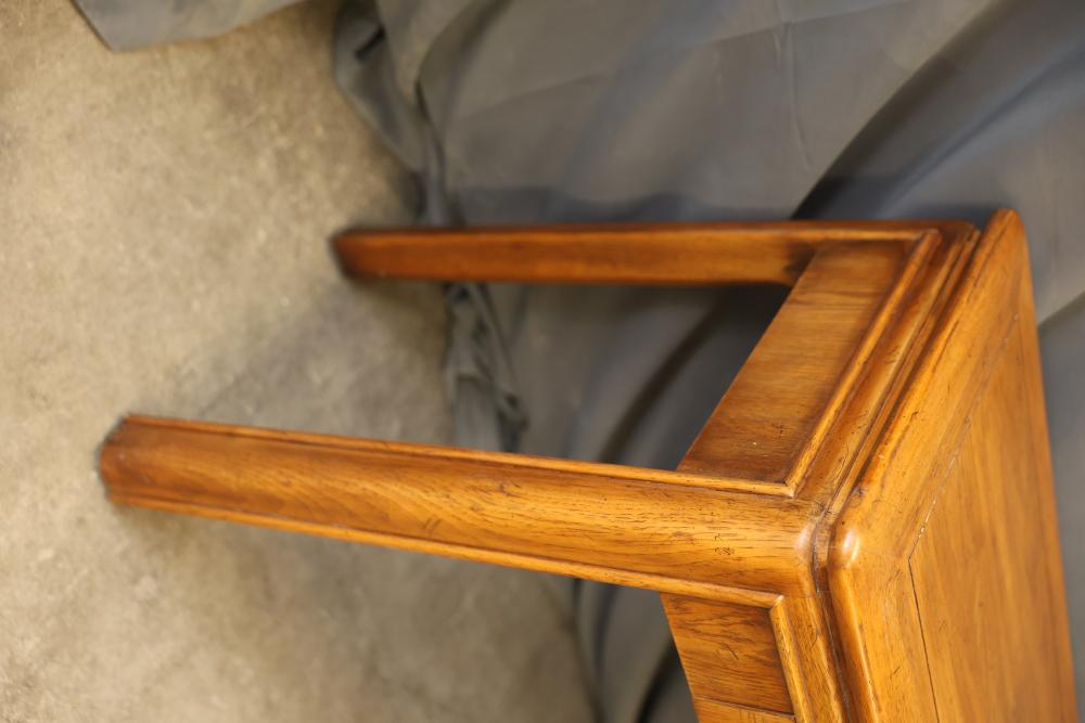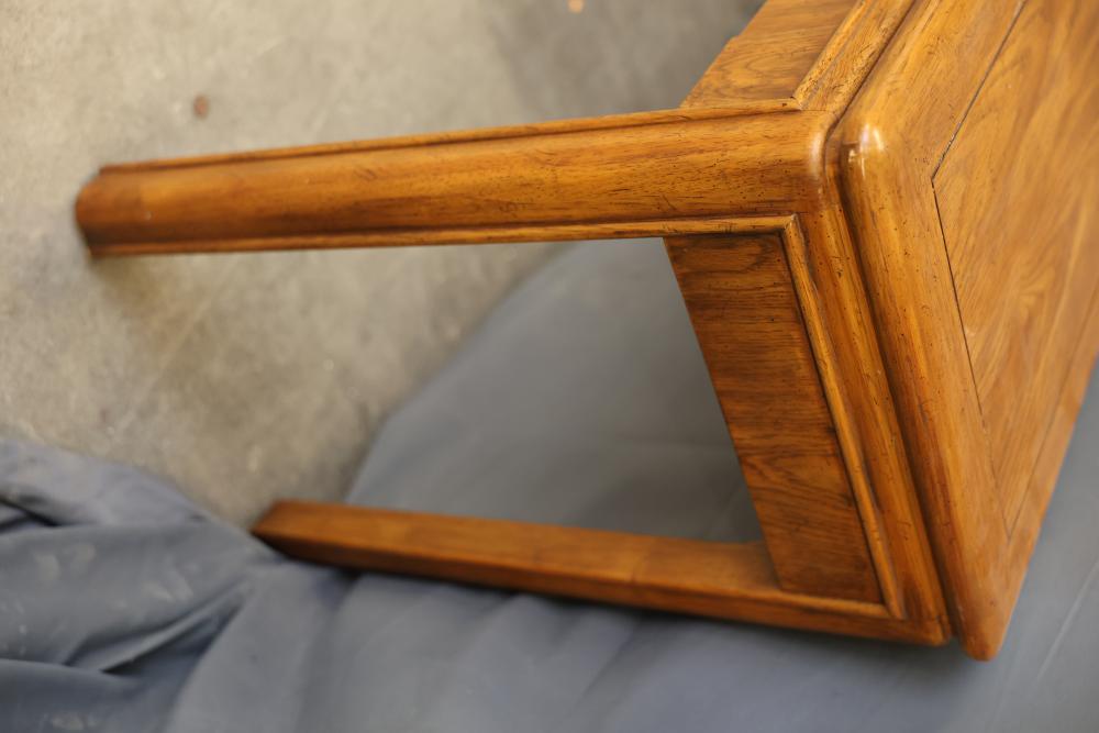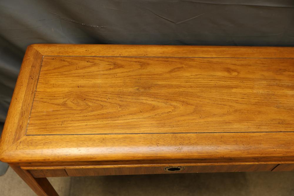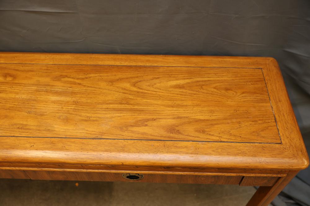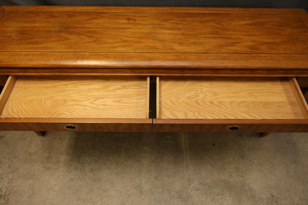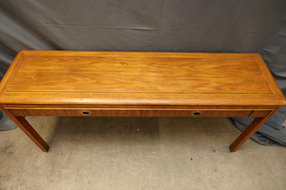 Wood Console Table With Two Drawers. Made of wood with a rectangular top design and dimensions measuring 61-inch L x 17-inch W x 26-inch D. Features two pull-out drawers with brass hardware. Pickup only.