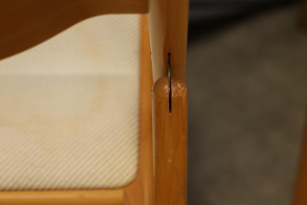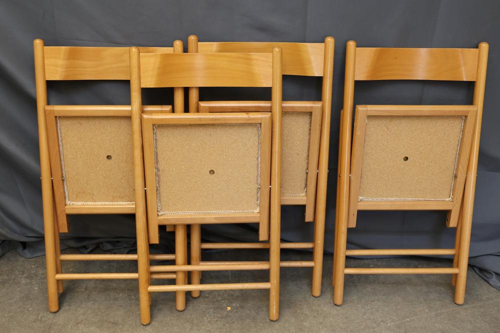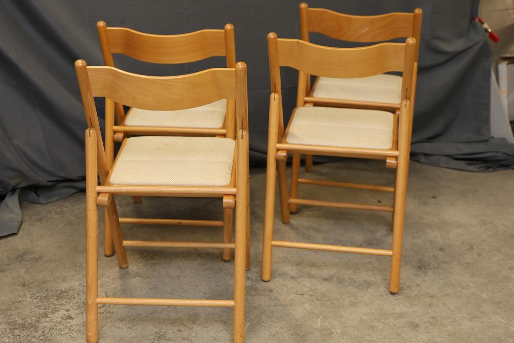 Four Wooden Folding Chairs with Beige Upholstered Seats. Features a natural wood finish with slatted backs and seats upholstered in a beige fabric. Designed for compact storage and versatile use in various settings. Pickup only.