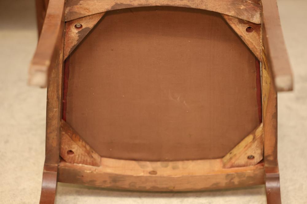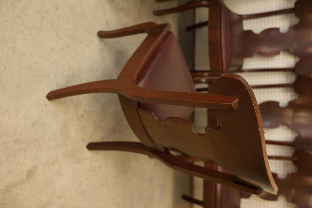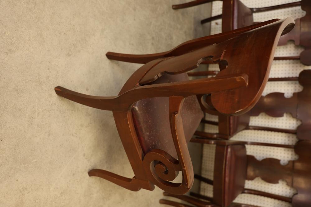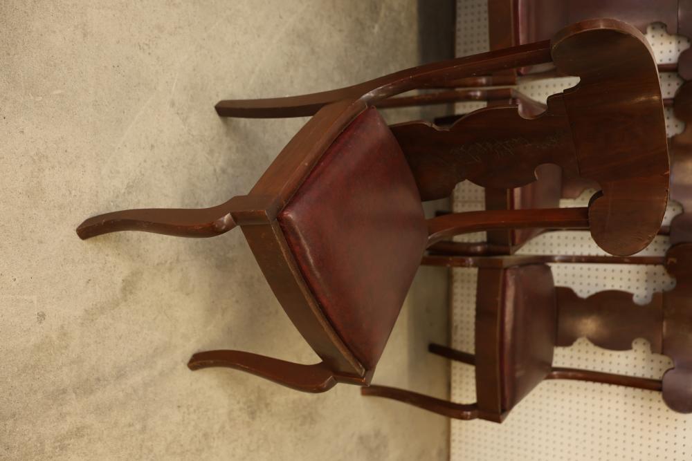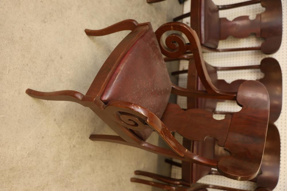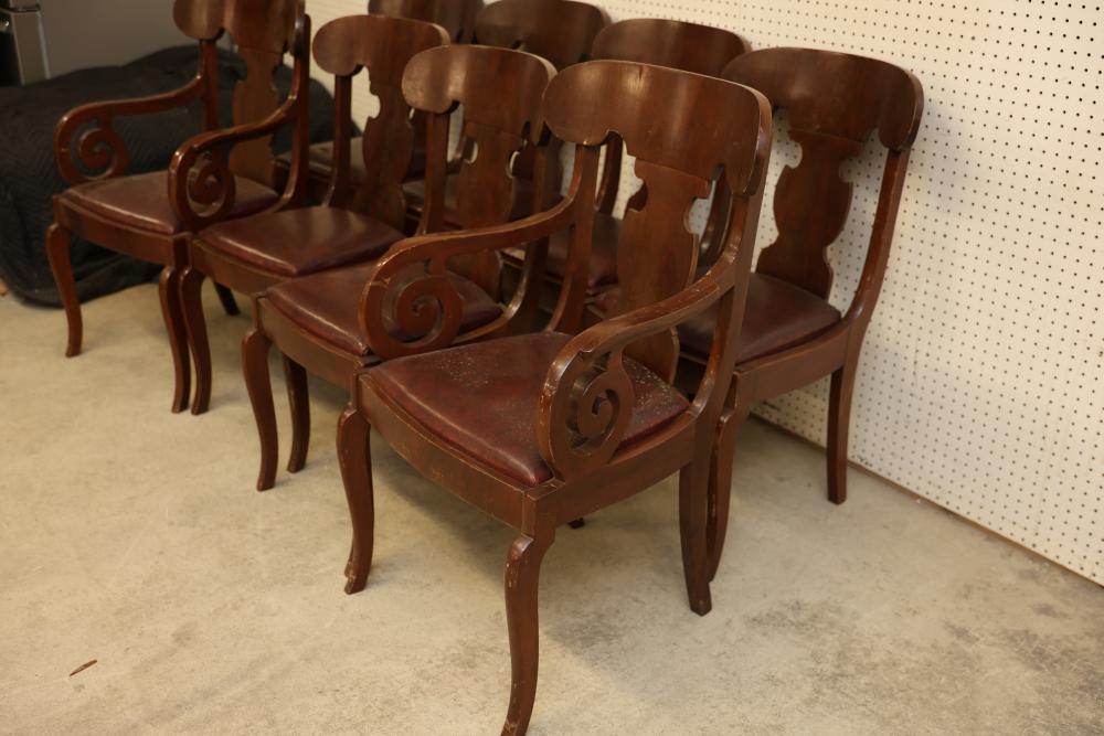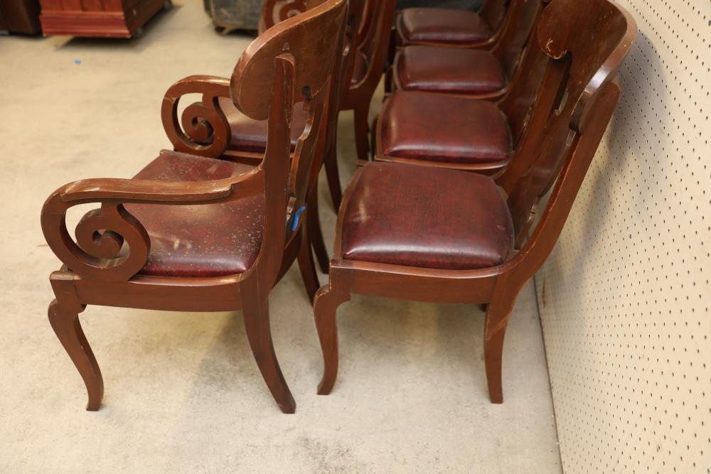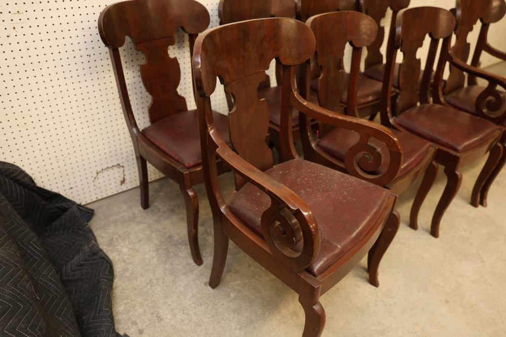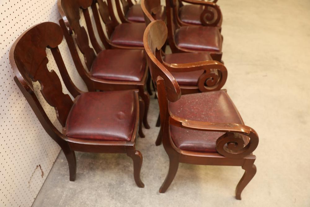 Nine Wooden Dining Chairs with Upholstered Seats. Includes eight side chairs and one armchair. Made of wood with curved backrests and legs, along with scroll arm details on the armchair. Upholstered with a leather or similar material. Seller Reports: Believed to be from the World's Fair in Chicago. Pickup only.