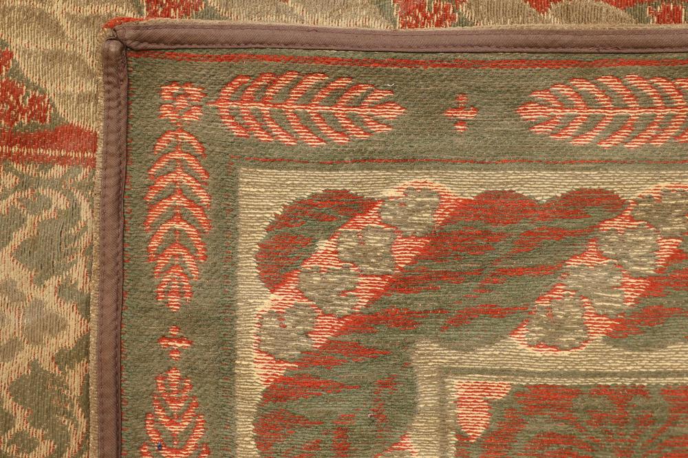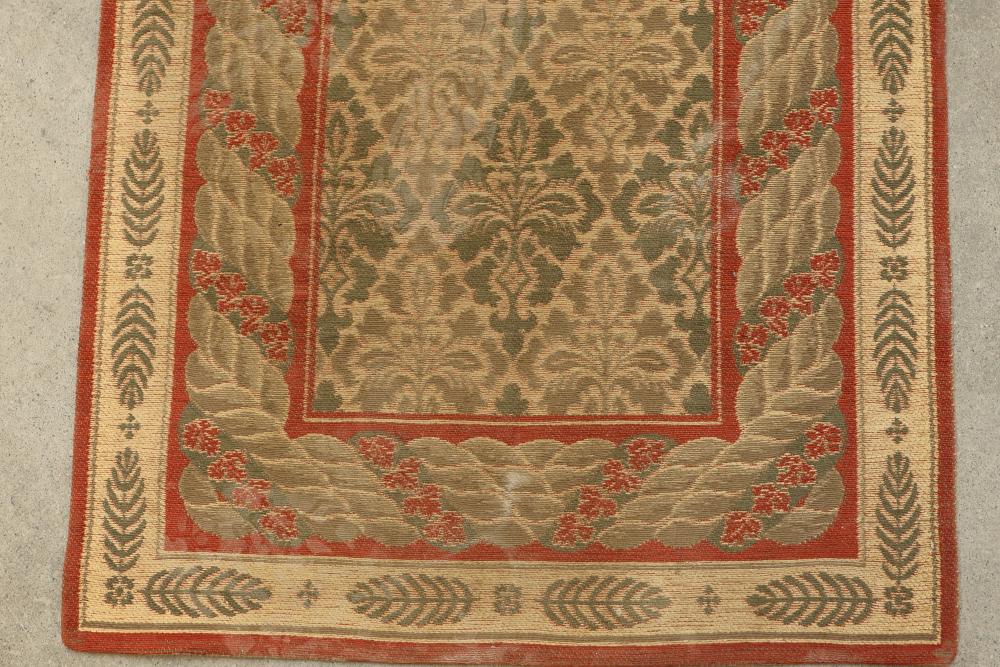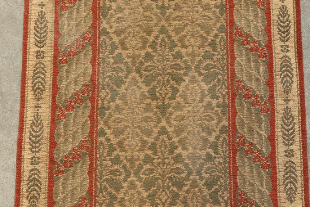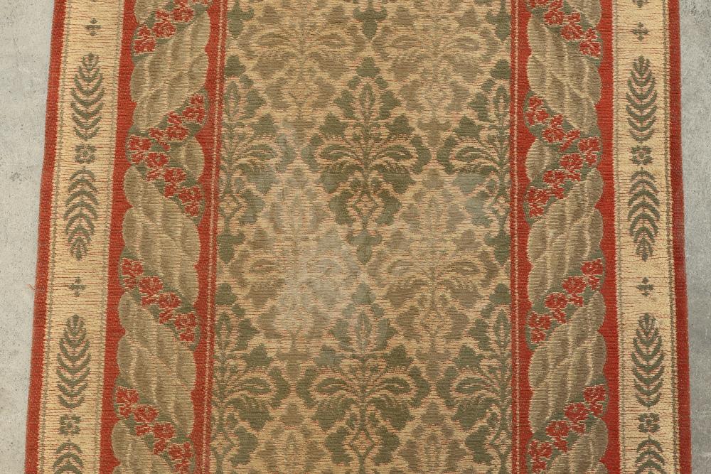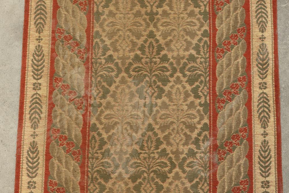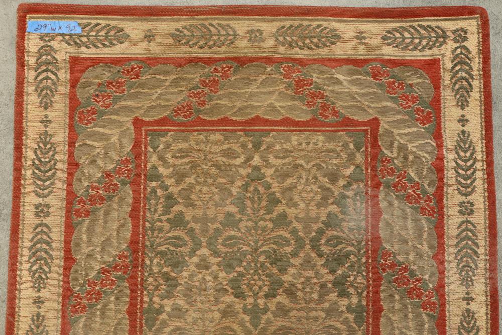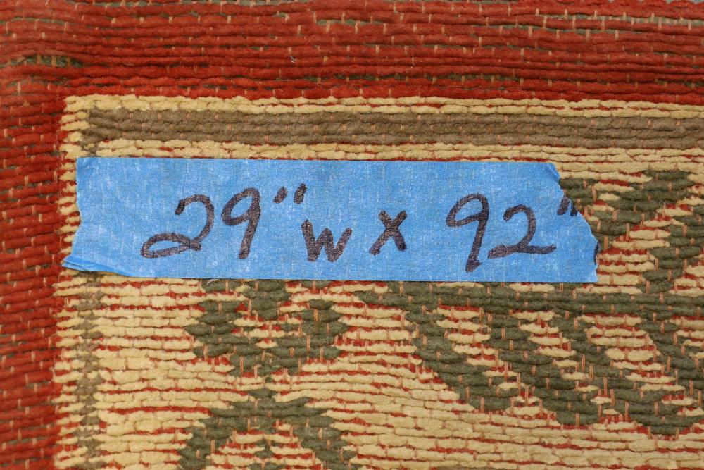 Handwoven 29-inch by 92-inch area rug featuring a decorative border with intricate patterns in red, green, and beige tones. The center area displays a symmetrical floral motif framed by detailed edging with leaf designs and accents. Pickup only.