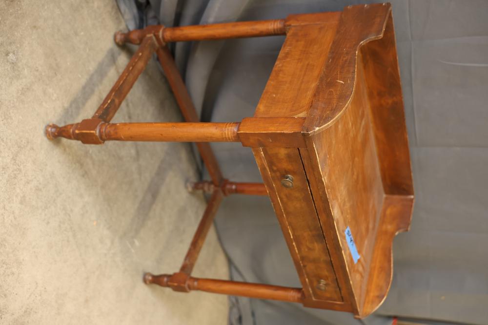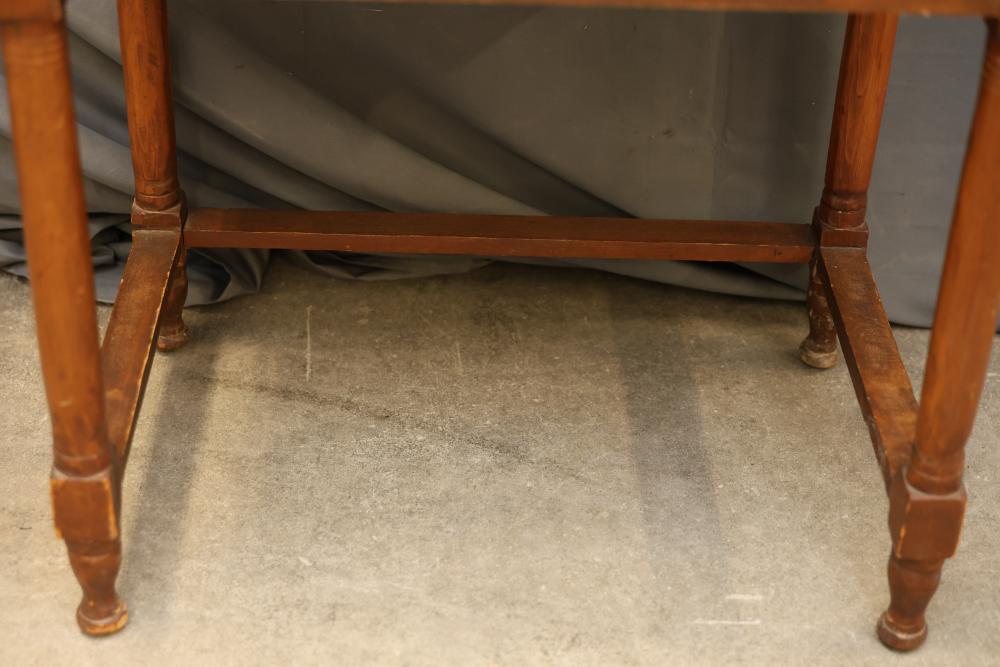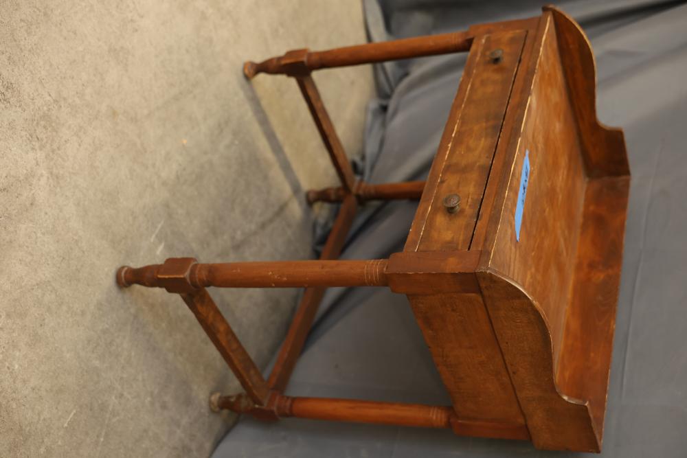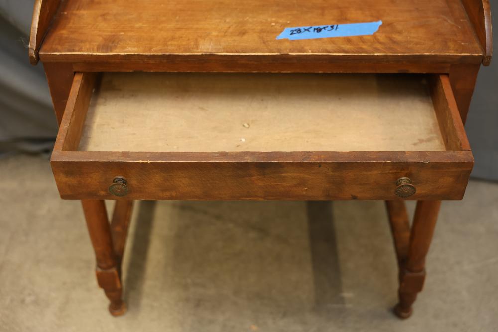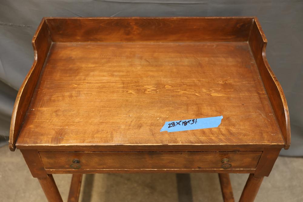 Wooden Writing Desk With Drawer and Raised Sides. Features a single front drawer with two pull knobs and raised sides on the tabletop. Constructed with four turned legs connected by stretchers. Measures 28 x 18 x 31 inches. Pickup only.