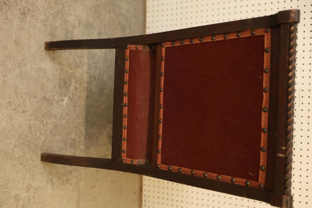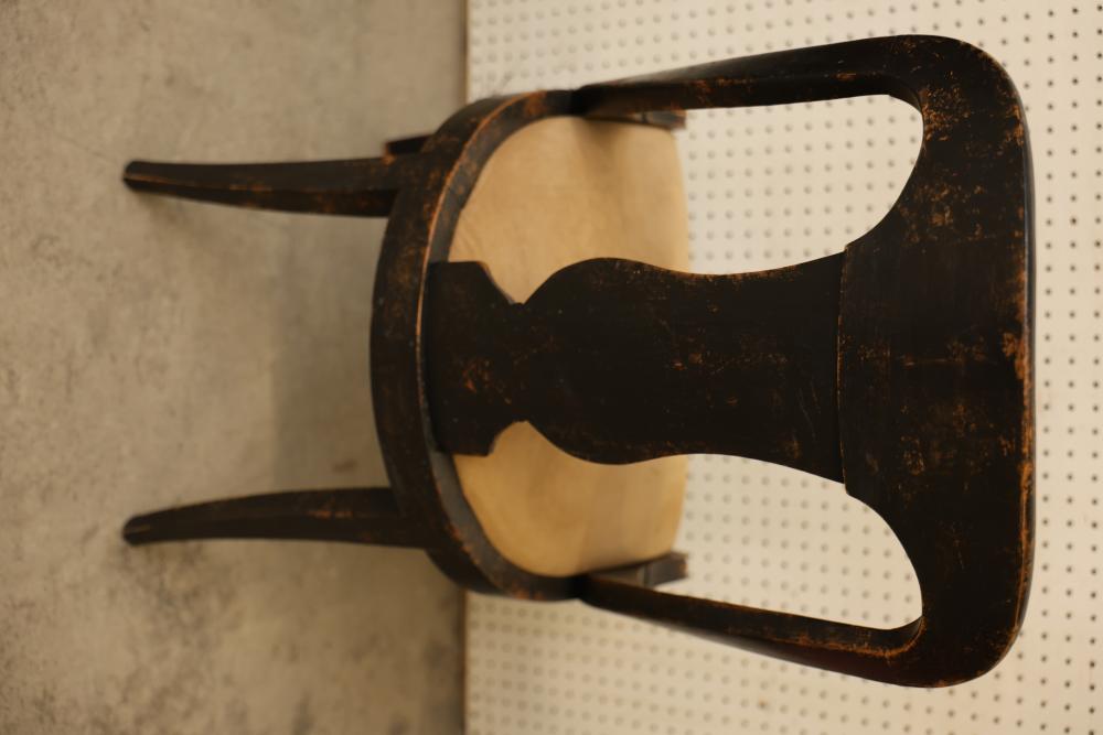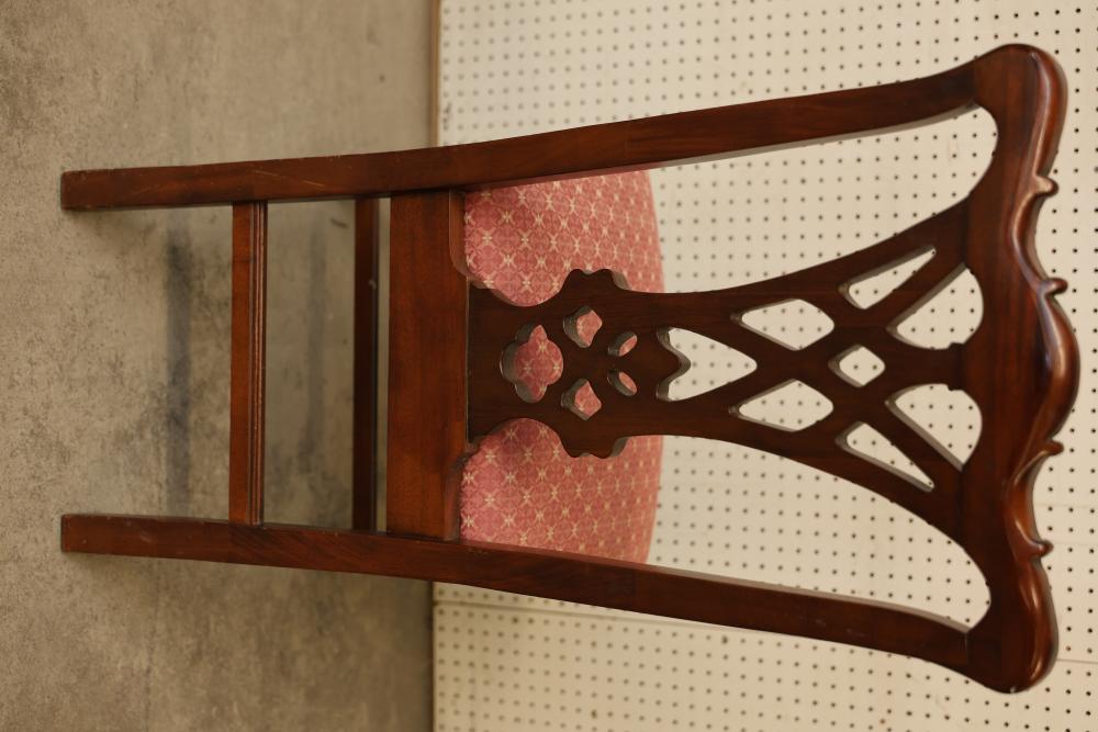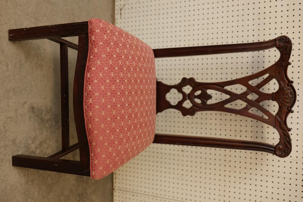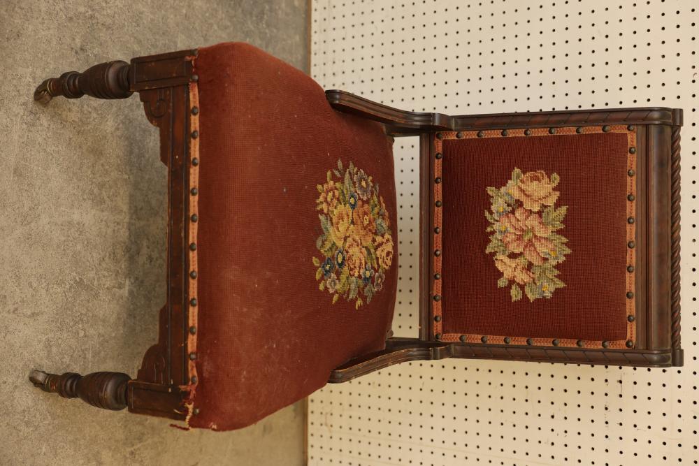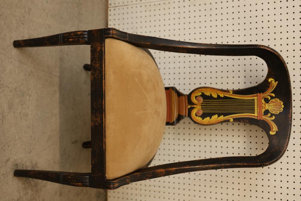 Three Unique Wooden Chairs with Upholstered Seats and Decorative Details. Includes one chair with a needlepoint seat and floral back, one with a lyre motif detailed in gold on a black frame, and one with a carved lattice back and patterned fabric seat. Pickup only.