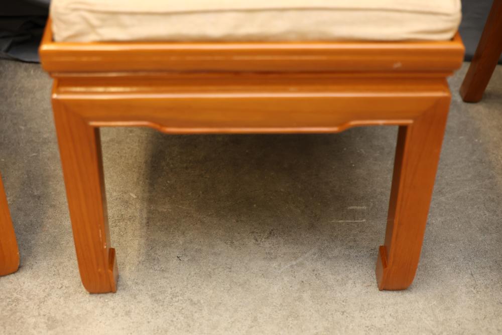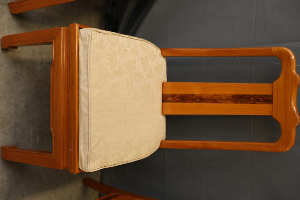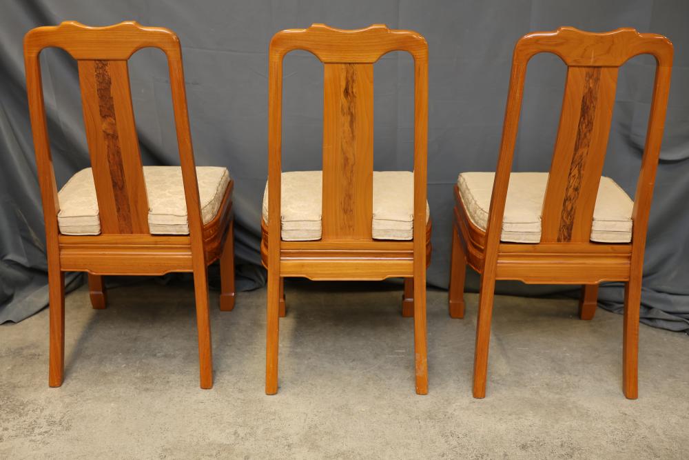 Three Wooden Dining Chairs with Cushioned Seats. Features a warm wood finish, a slatted backrest design, and cream-colored cushioned seats. Pickup only.