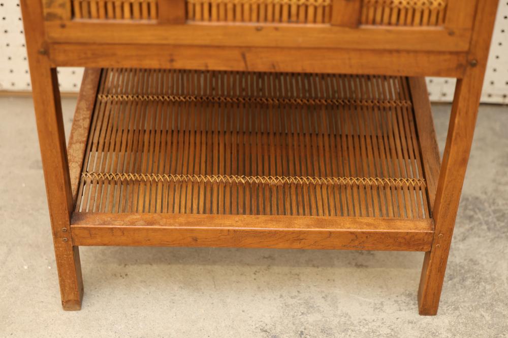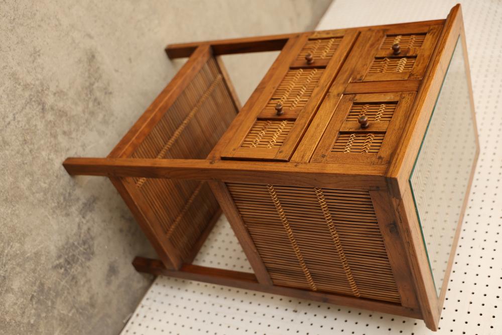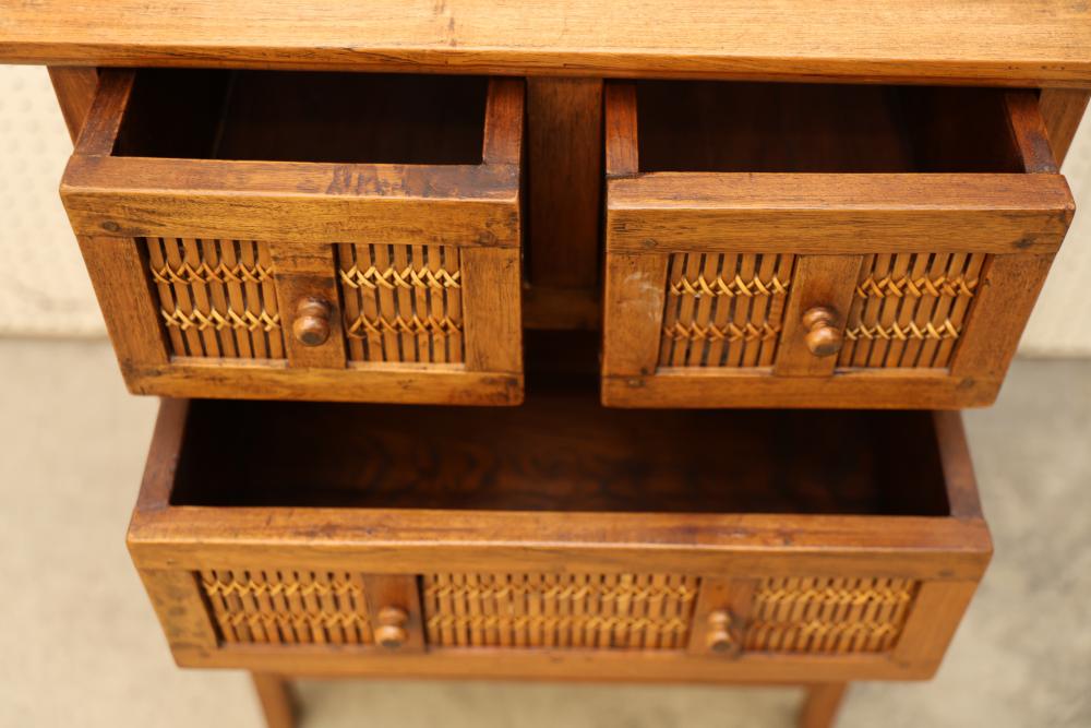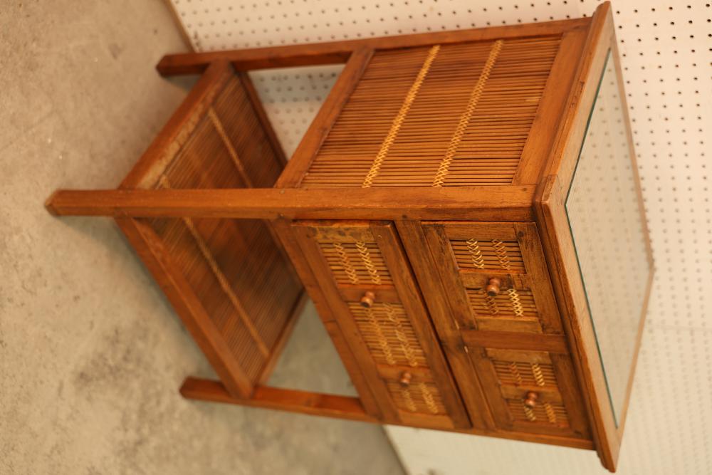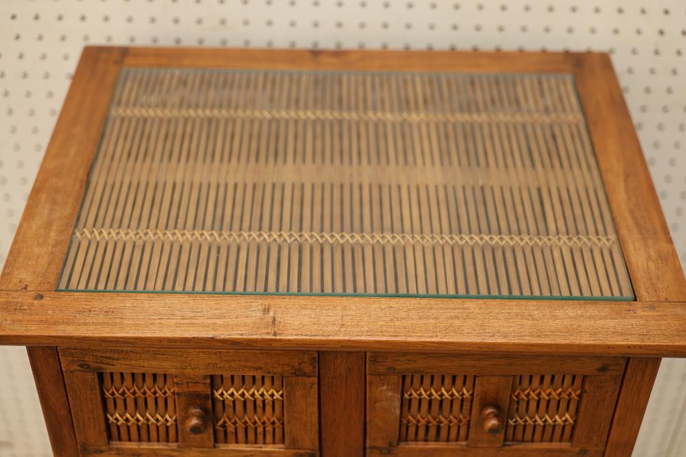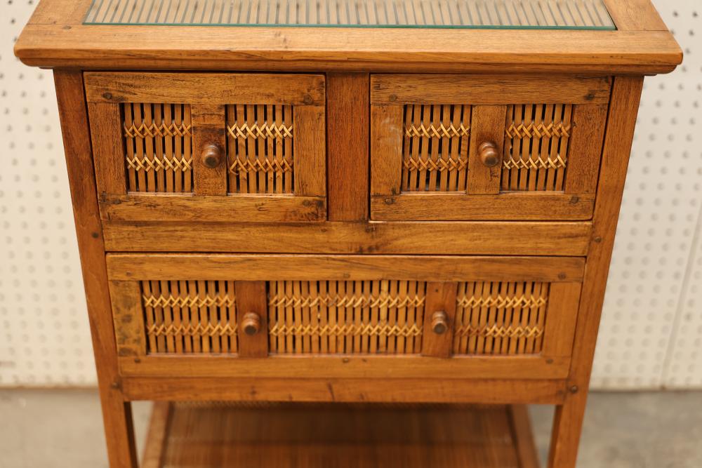 Wooden Side Table with Glass Top and Woven Detailing. Features two small upper drawers, one larger lower drawer, and a bottom shelf for storage. Includes a decorative woven design on the drawer fronts and sides, along with a durable glass inset on the top surface. Designed with wooden knobs and a sturdy frame. Pickup only.
