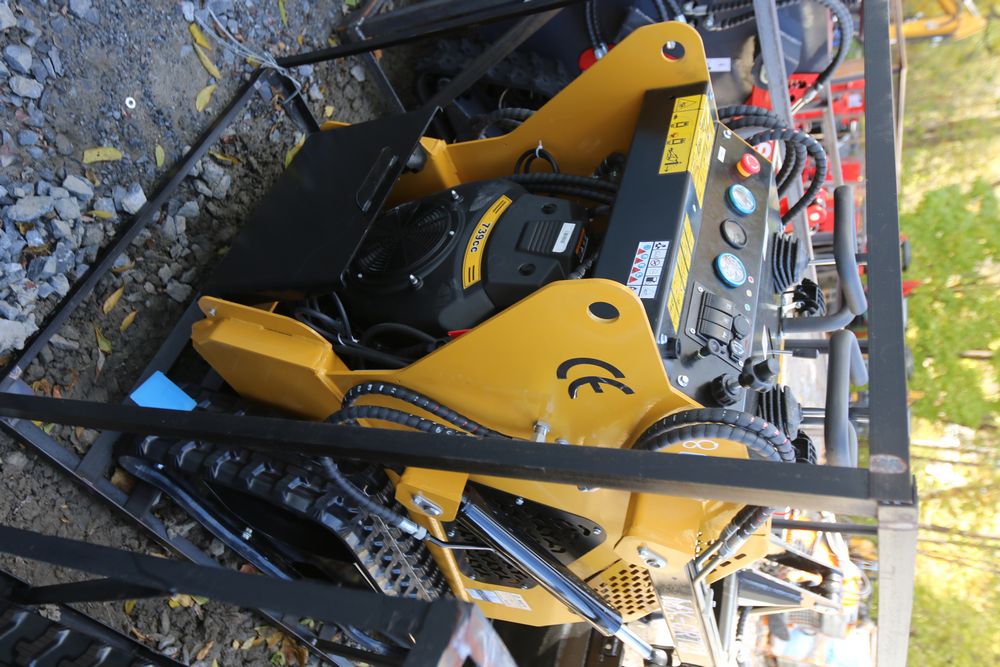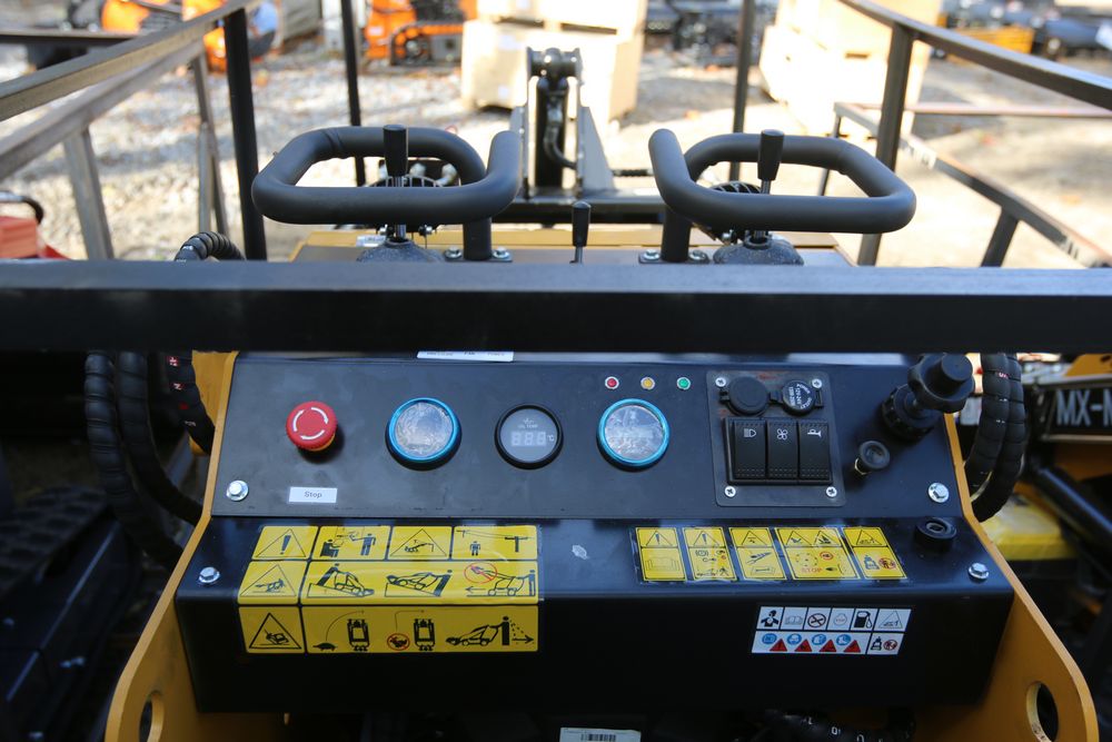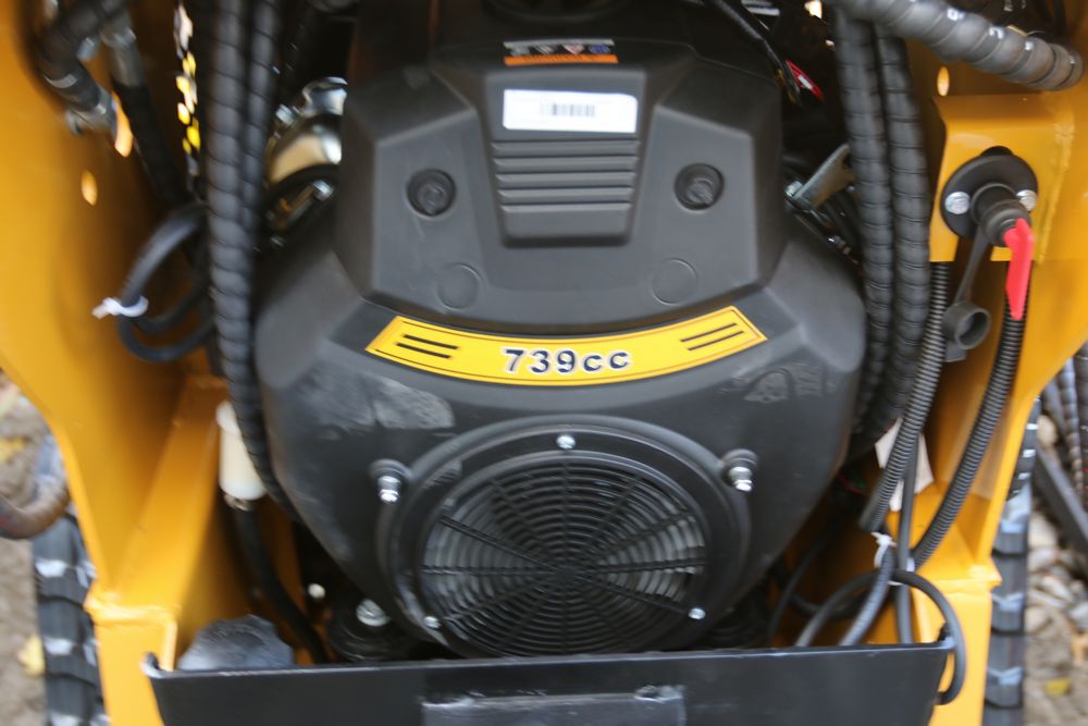 New 2025 AGT MX-CRT23 mini skid steer loader equipped with a 739cc engine, hydraulic hoses, an operator control panel with dual hand controls, and a front bucket attachment.