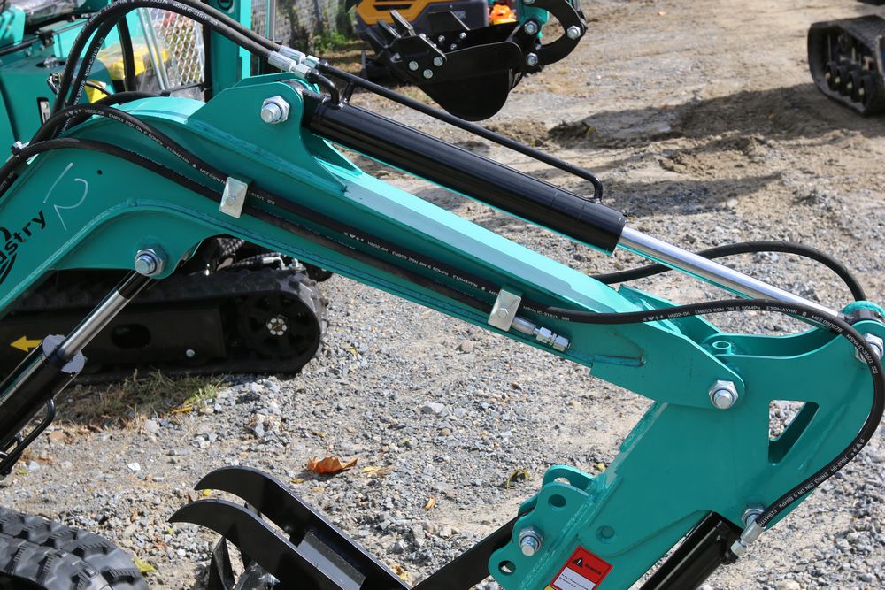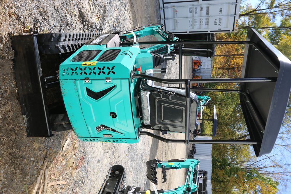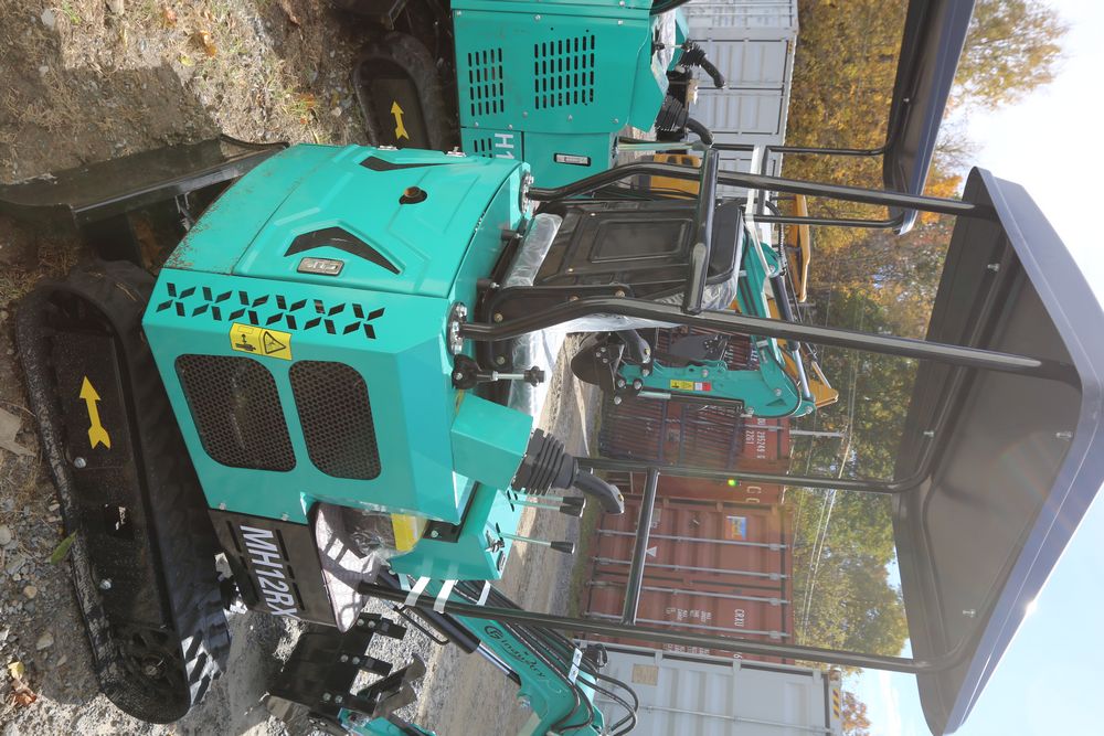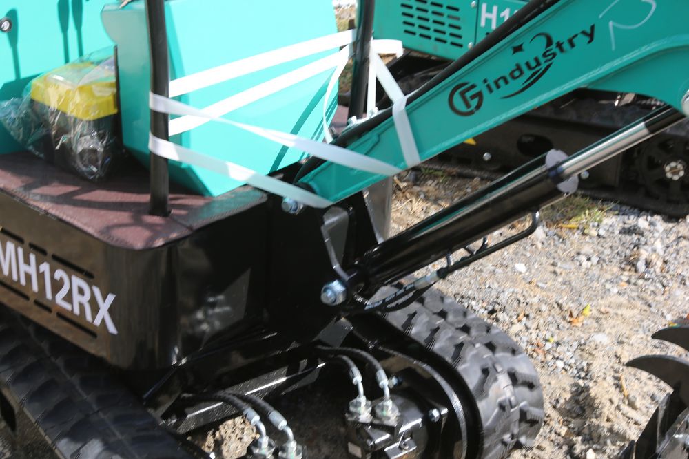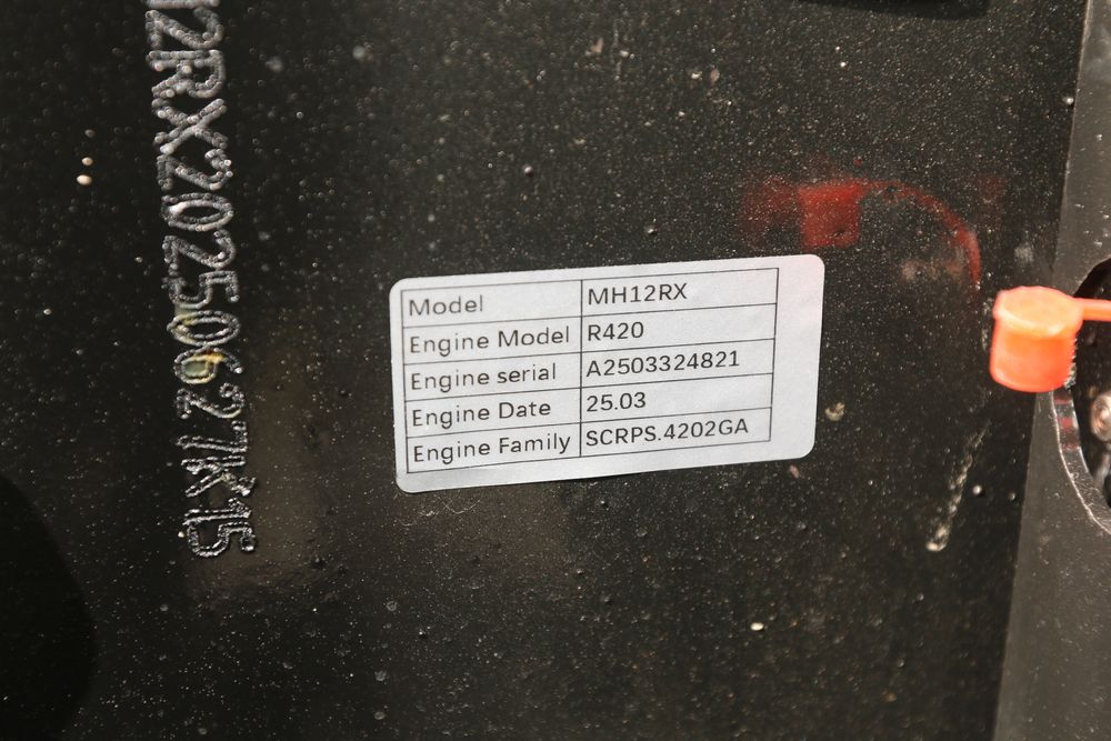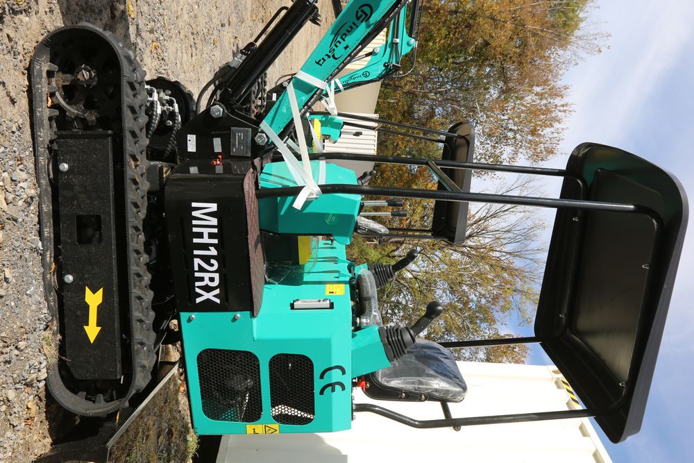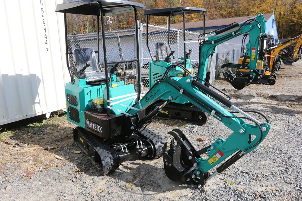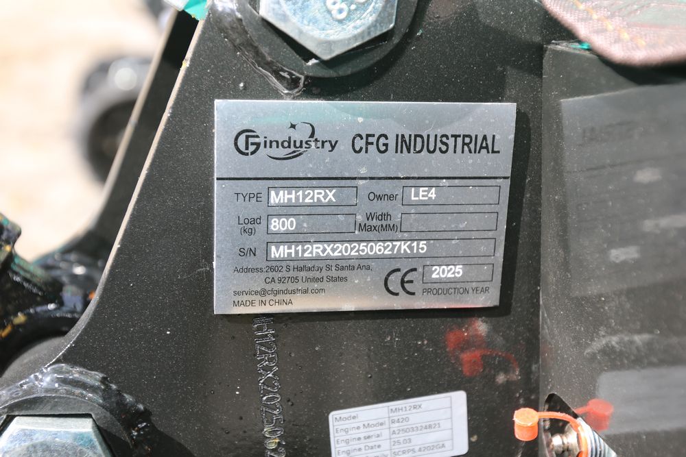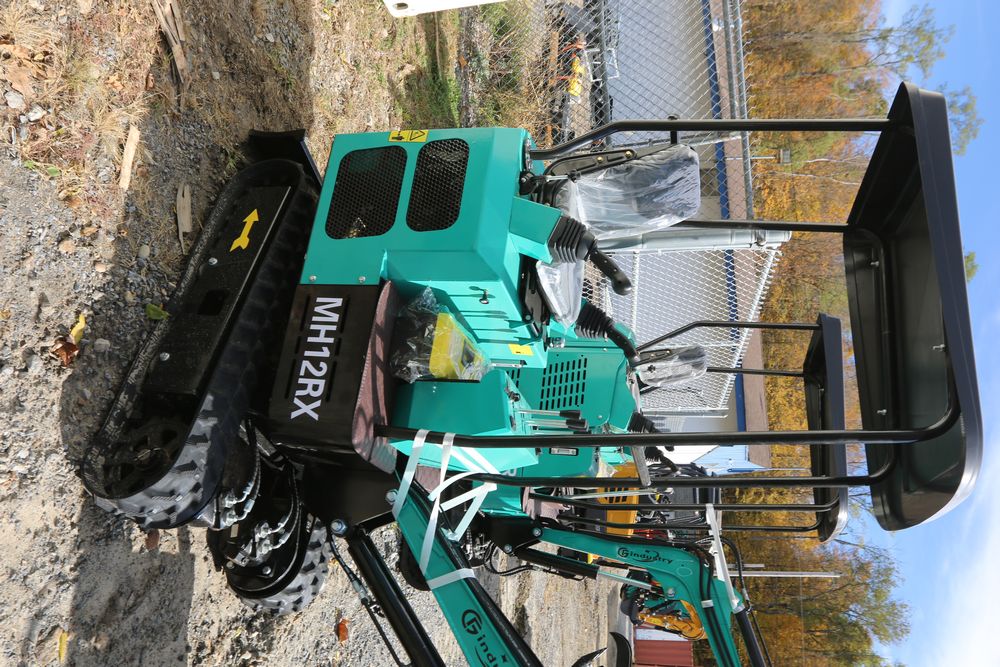 New 2025 CFG Industrial MH12RX mini excavator with bucket, thumb, gas engine. Hours meter reads less than one hour.