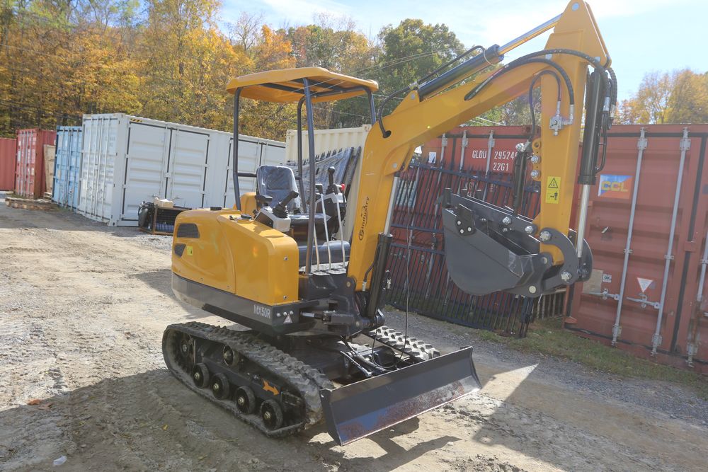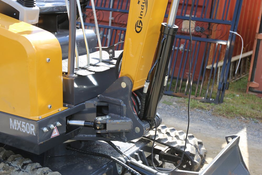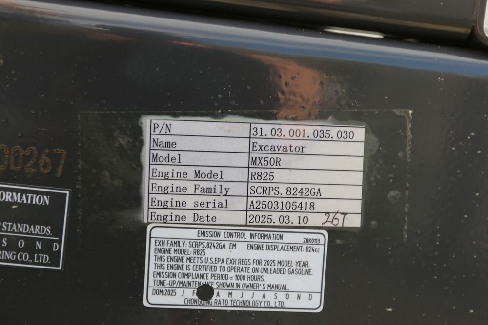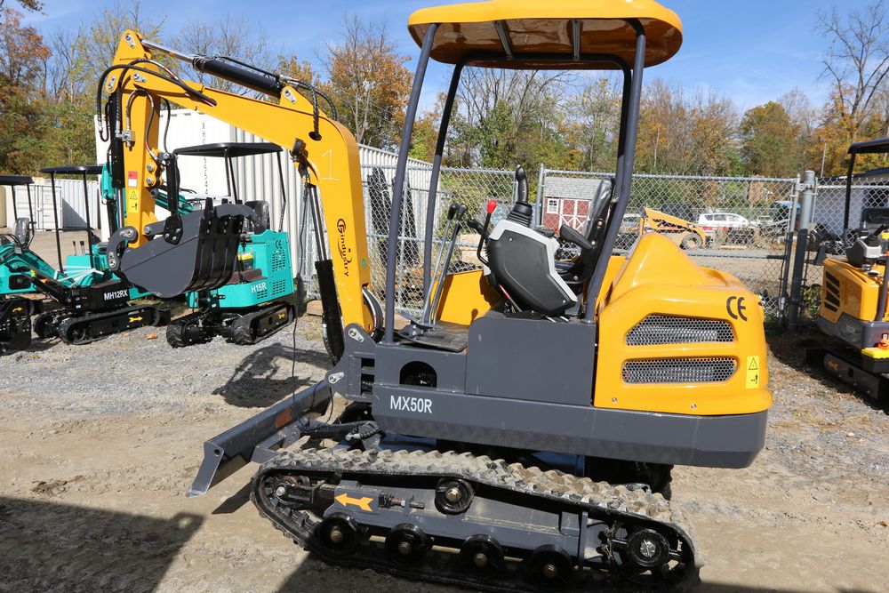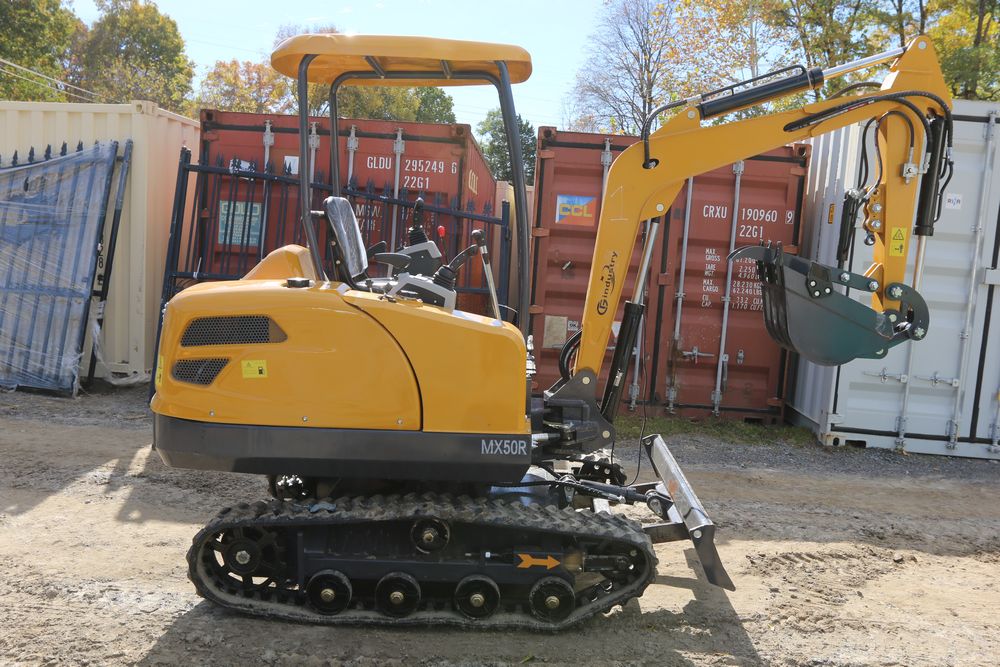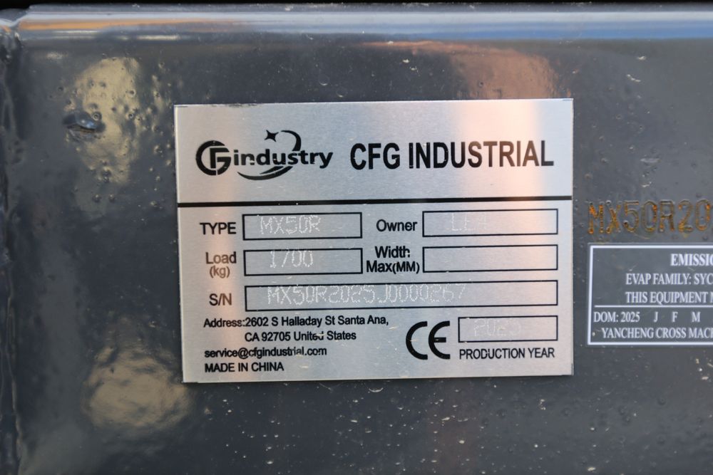New 2025 CFG Industrial MX50R mini excavator with a 1700 kg load capacity. Features include a R825 engine model, a hydraulic thumb, and off-road undercarriage expansion. Includes a dozer blade, tracked base, and ergonomic operator seat. Less than 1 hour of use.