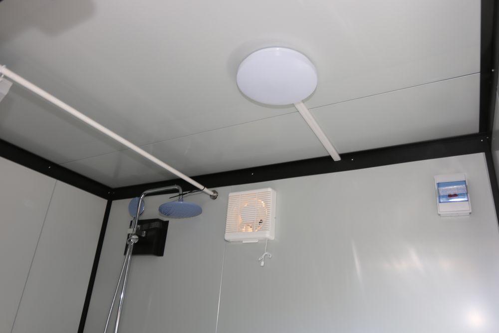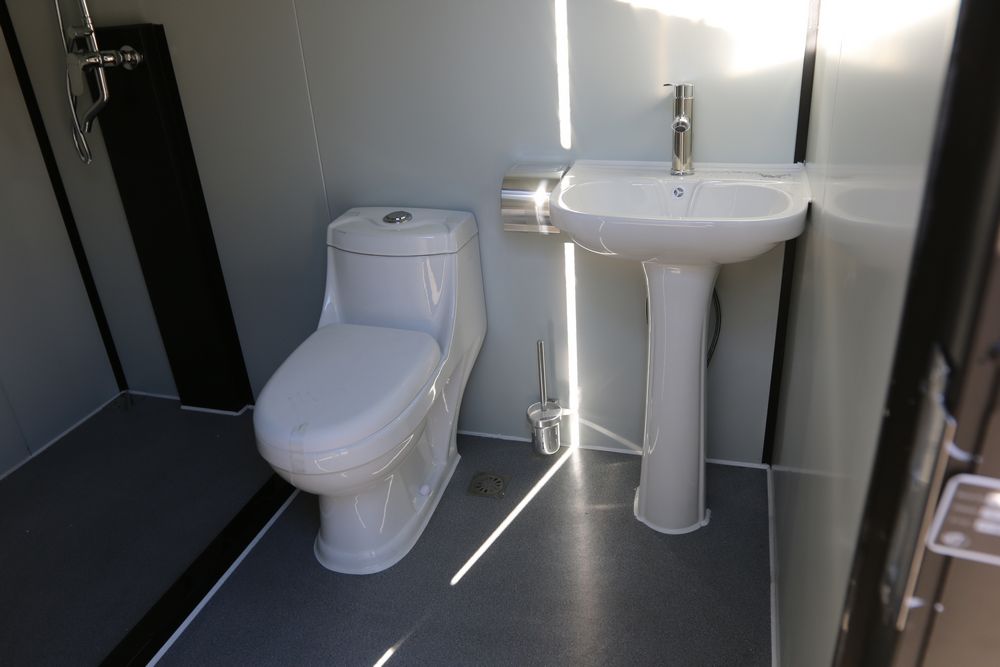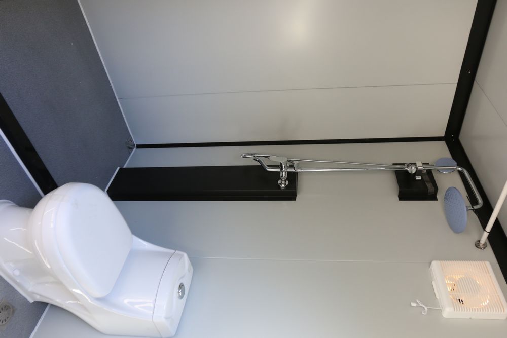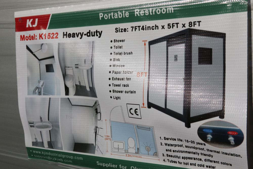 New 2025 portable restroom 7'4" X 5' X 8', includes shower, toilet, toilet brush, sink, window, paper holder, exhaust fan, towel rack, shower curtain, light, model K1522.