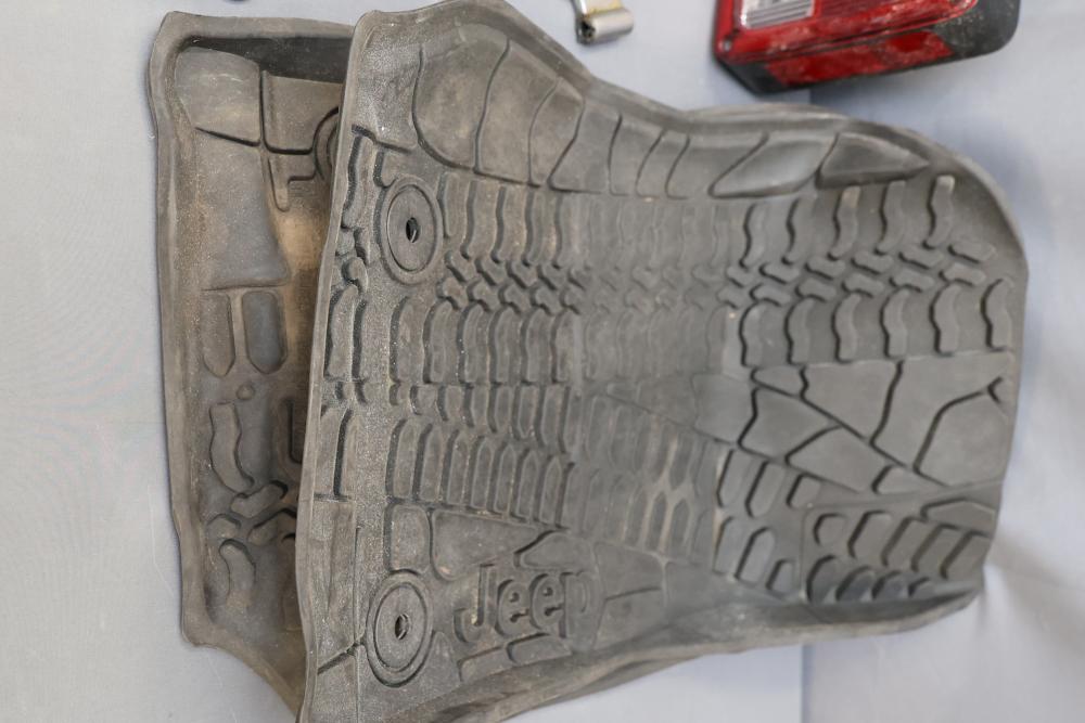 Parts for a 2015 Jeep Wrangler JK Including Lights, Door Components, and Wiring. Includes headlights, brake lights, fog lights, door hinges, door handles, floor mats, and various wiring. Components appear organized and ready for use. Pickup only.