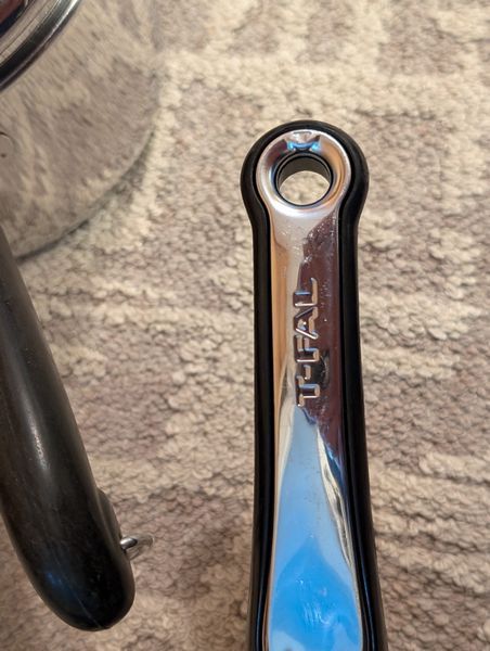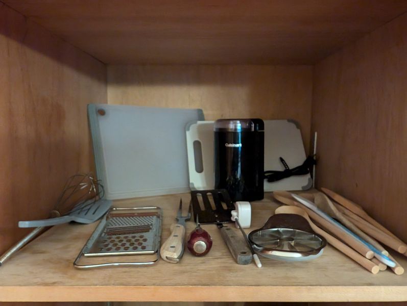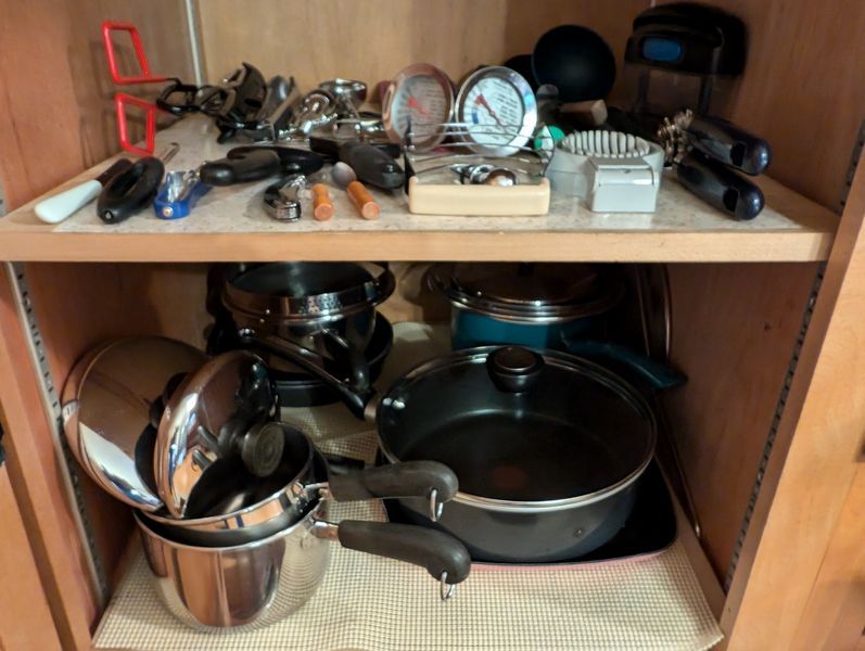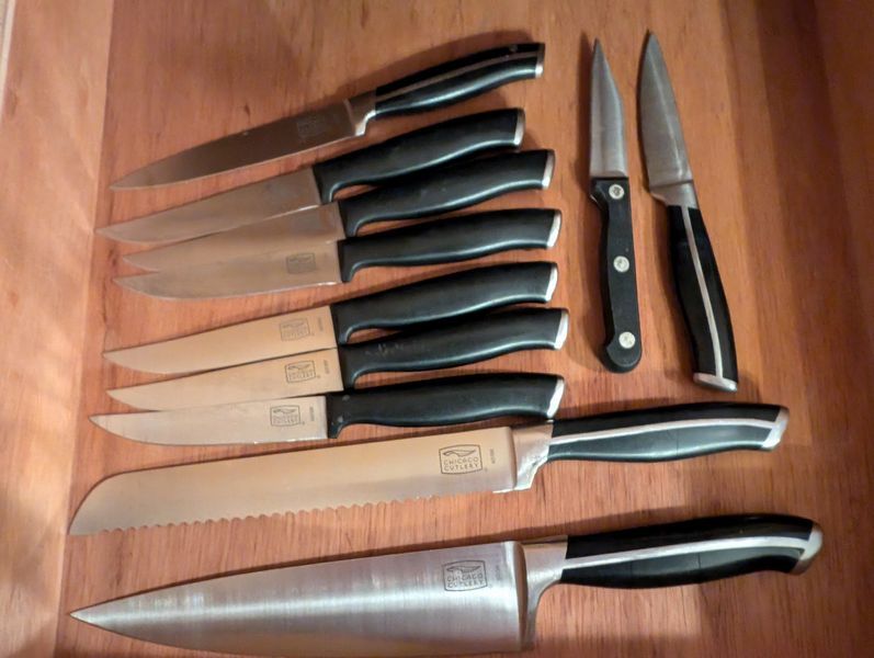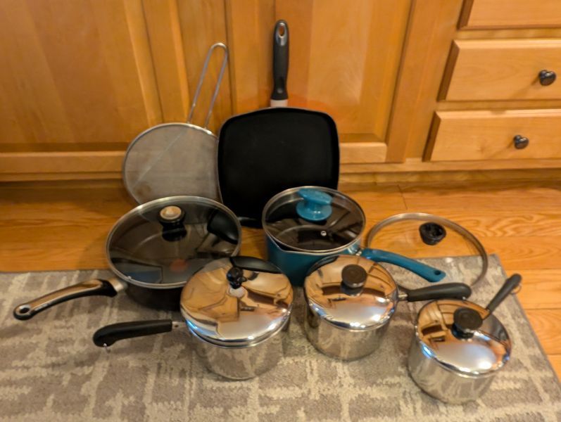 Cookware and Knives. Assorted pots & pans, incl T-fal; cutting boards; coffee grinder; Chicago Cutlery knives; utensils. See photos for details.
