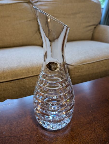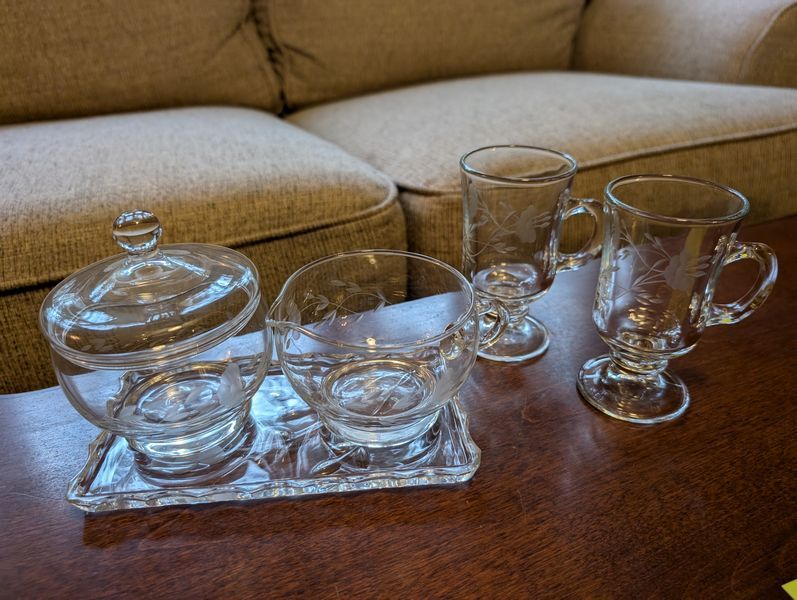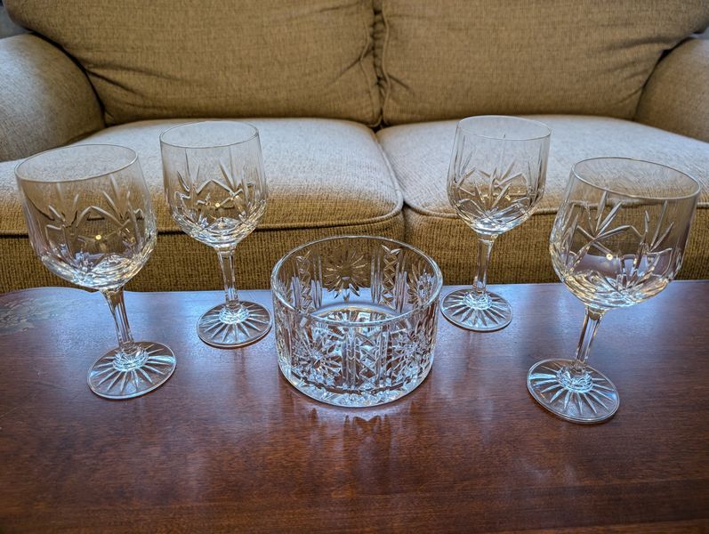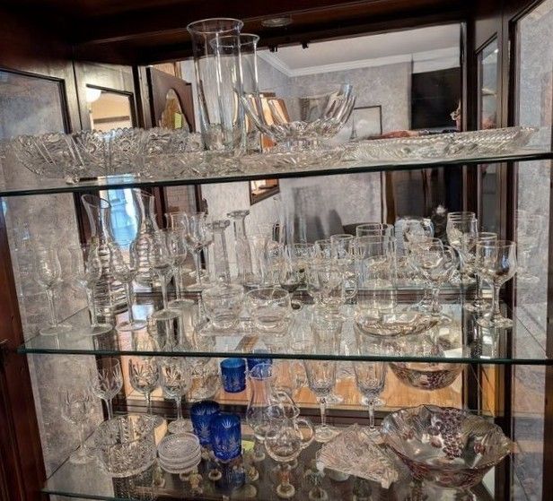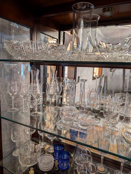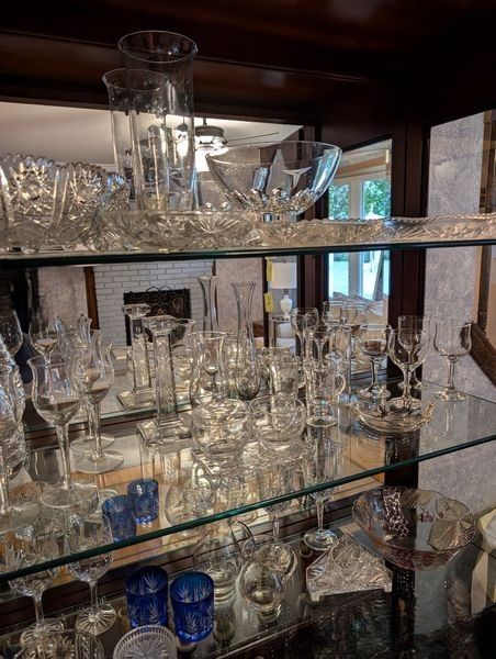 Crystal and Glass Entertaining. Incl vases; bowls; stemware; creamer & sugar set with tray; decanter. Mostly clear, three pieces colored glass. See photos for details and maker's marks of crystal items. Loc inside hutch offered with lot #19.