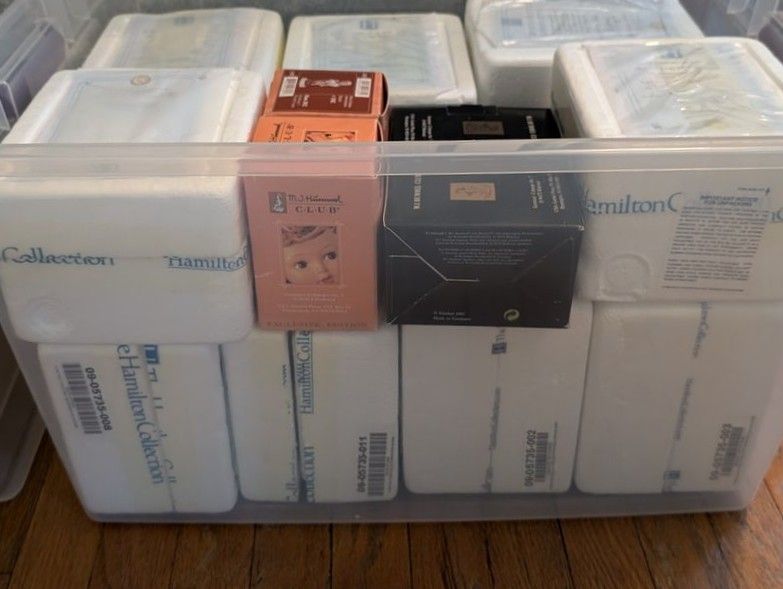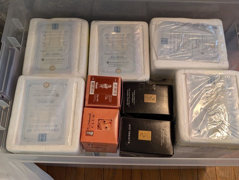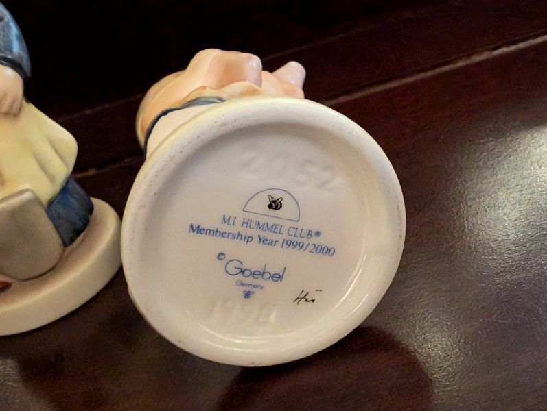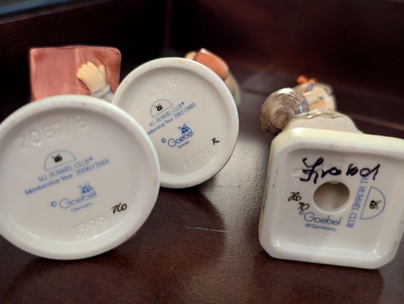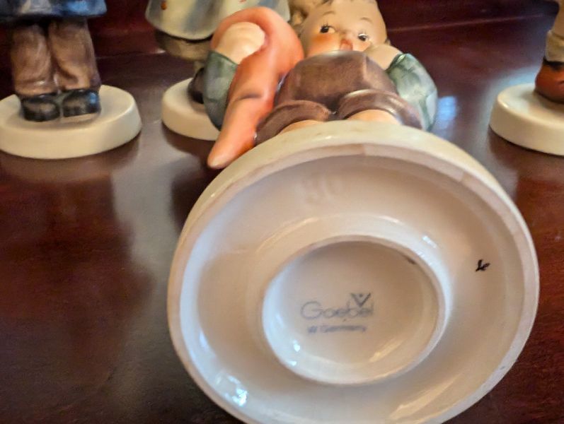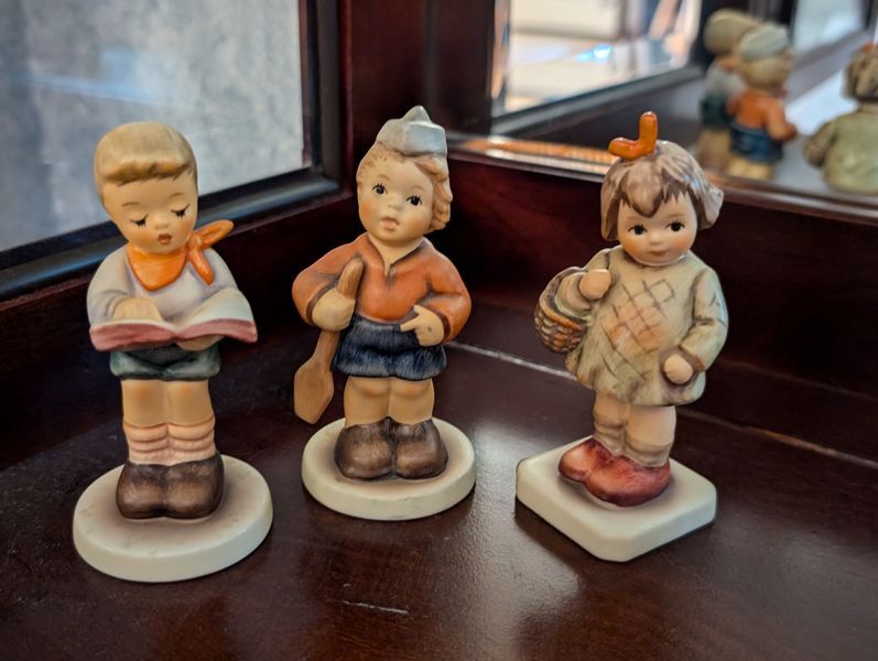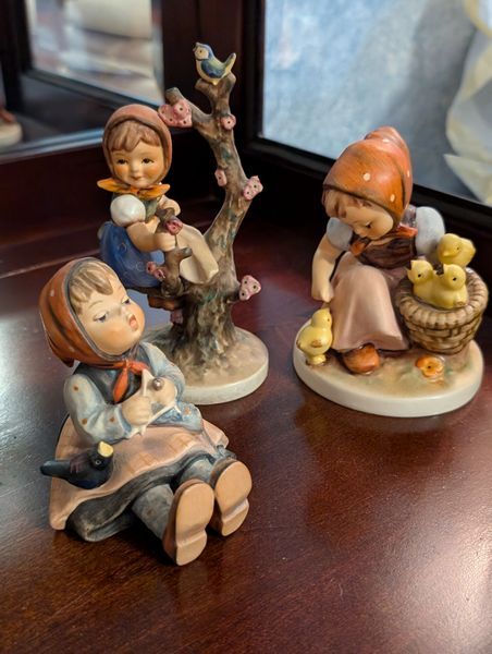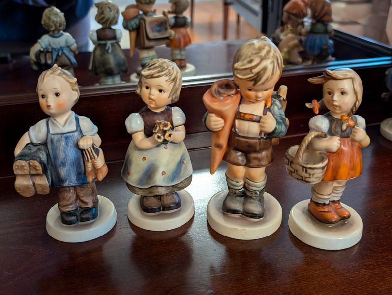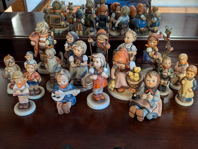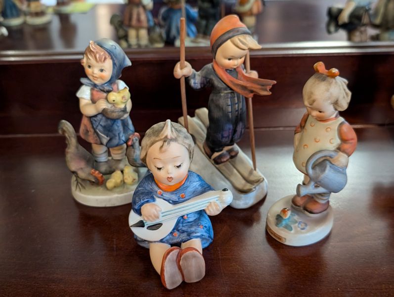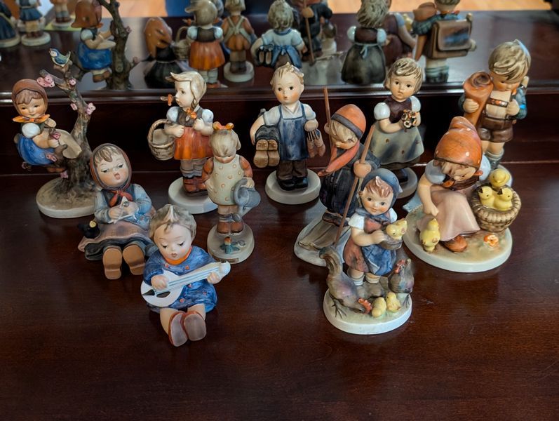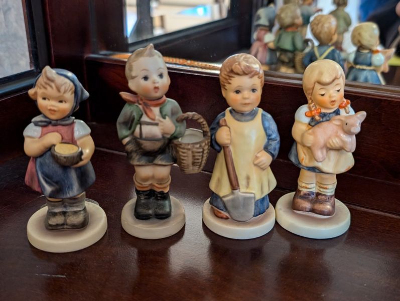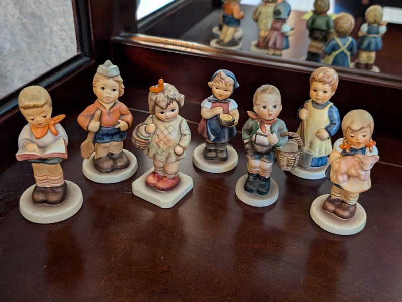Hummels. Assorted sizes from 3.5"H (7 pieces) to 6"H (11 pieces), eighteen total. See photos for details. Boxes for most also including (see photo). Hutch seen in photos and items reflected not included