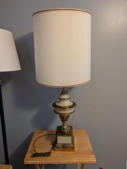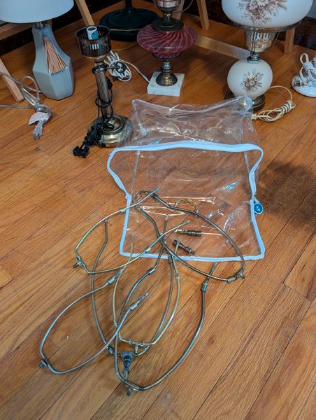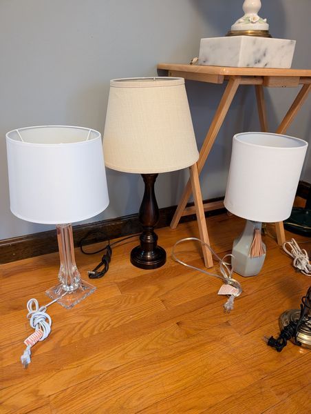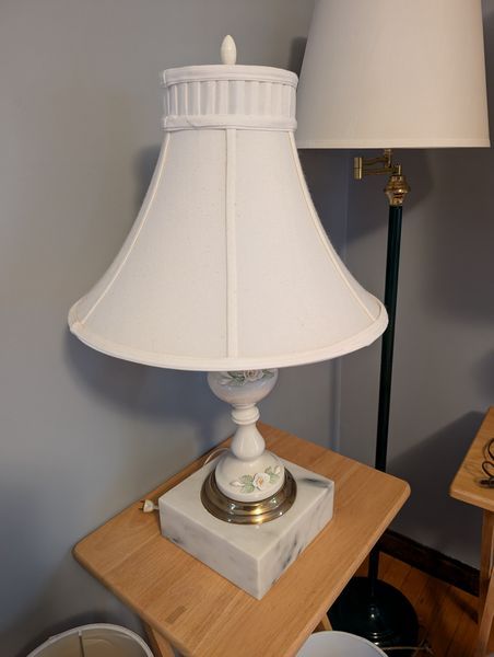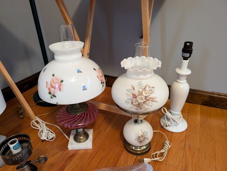 Lamps, Mostly Vintage and Tray Tables. Ten lamps: (1) floor, 5'H; (5) table lamps with fabric shades (tallest 3'H, shortest 18"H); two boudoir lamps with glass shades & hurricane globes; (two) lamps bases only; assorted lamp harps; marble base 8'sq x 2.5"H; set of two folding snack tables.