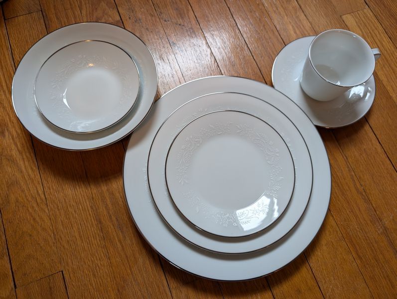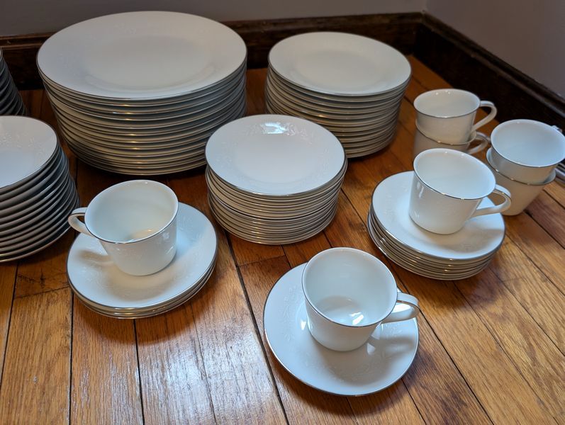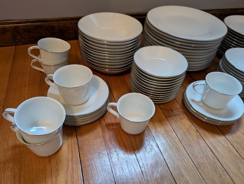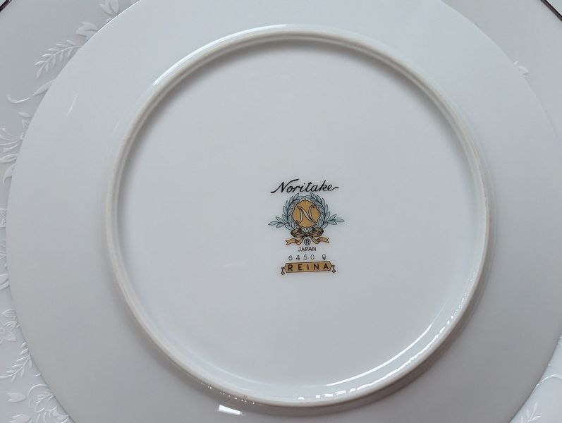 Noritake Dish Set. Noritake "Reina" 6450Q 7-pc, serv/12 plus additional pieces with 10.5"diam dinner dish. Matches serving pieces in lots #11 &12.See photos for more details.