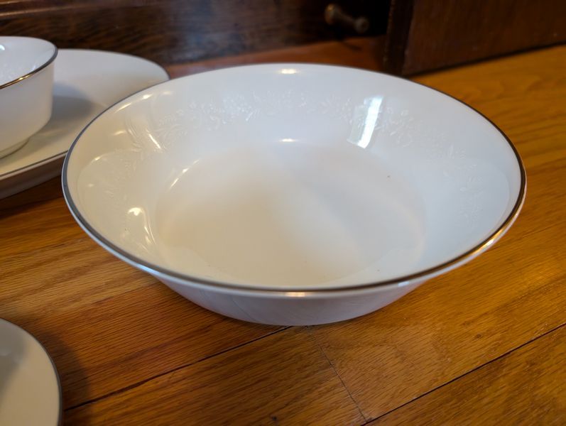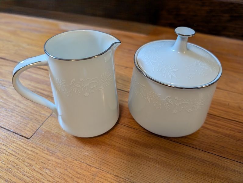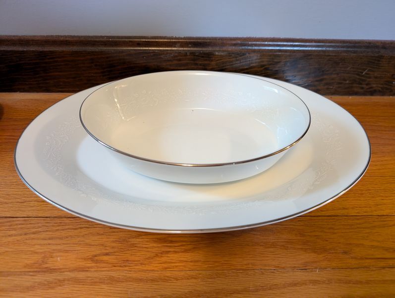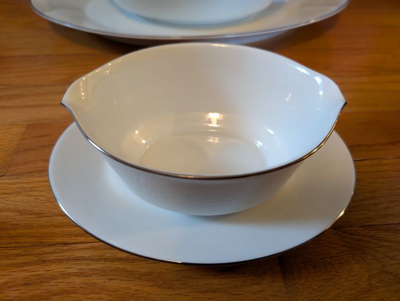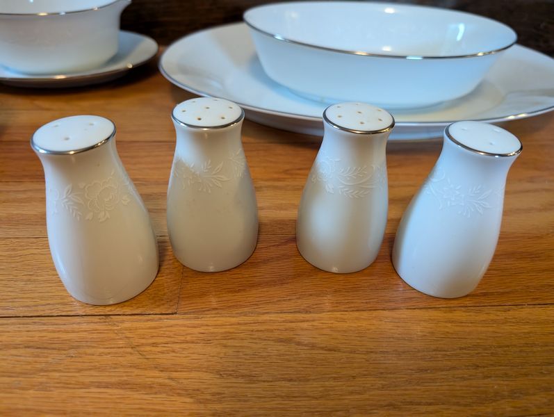 Noritake Hostess Pieces. Noritake "Reina" 6450Q hostess pieces, including oval platter 1'Wx16"L; round bowl, 9"diam; oval bowl, 7"wx9.5"L; creamer & covered sugar; gravy boat with tray; (2) S&P sets. Matches pieces in lots #10 &12.See photos for more details.