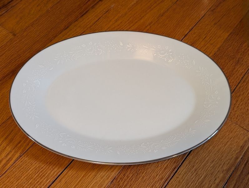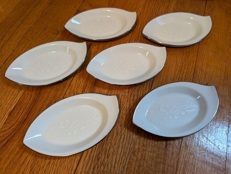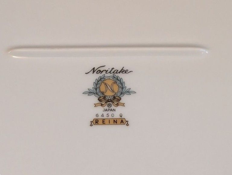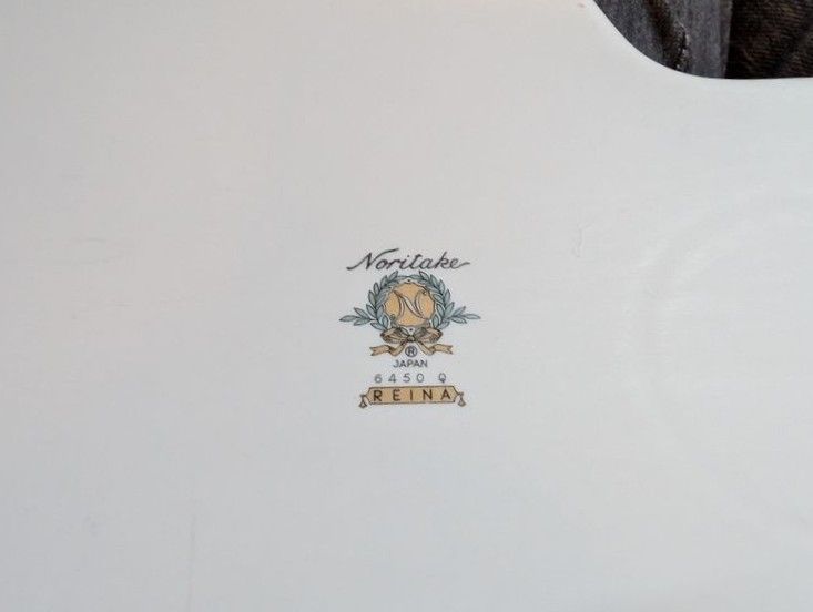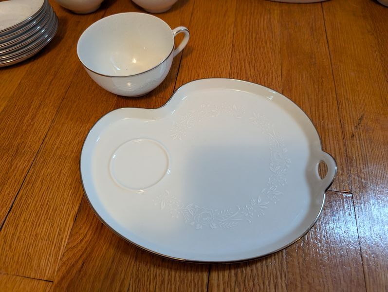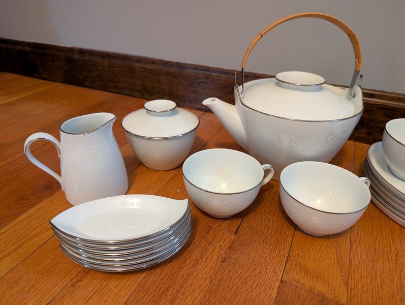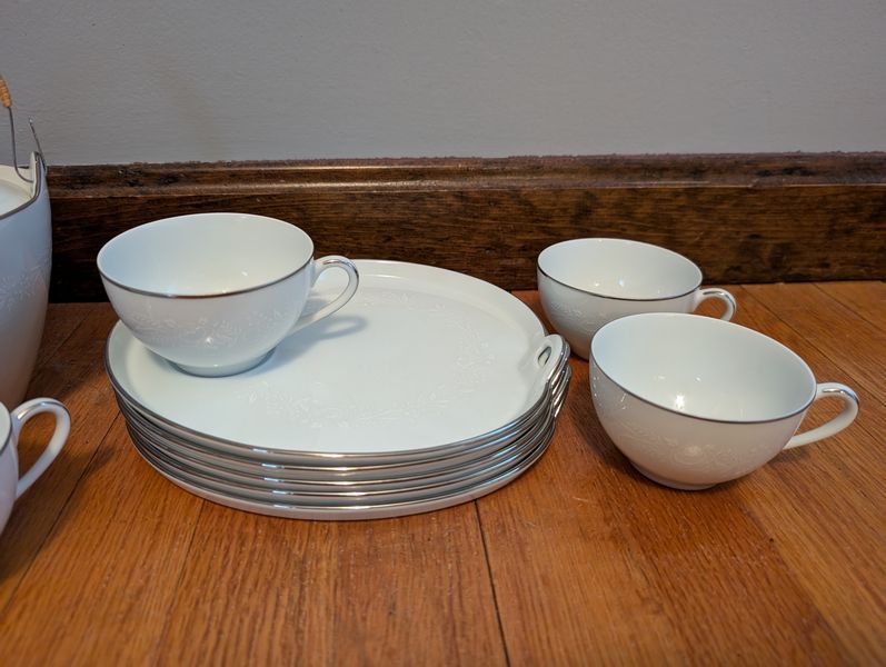 Noritake Luncheon Set. Noritake "Reina" 6450Q service of five luncheon plates with handled cups; tea pot with bamboo handle; small oval platter, 8.5"Wx1'L; creamer & covered sugar set; set of six small dishes. Matches pieces in lots #10 &11.See photos for more details.